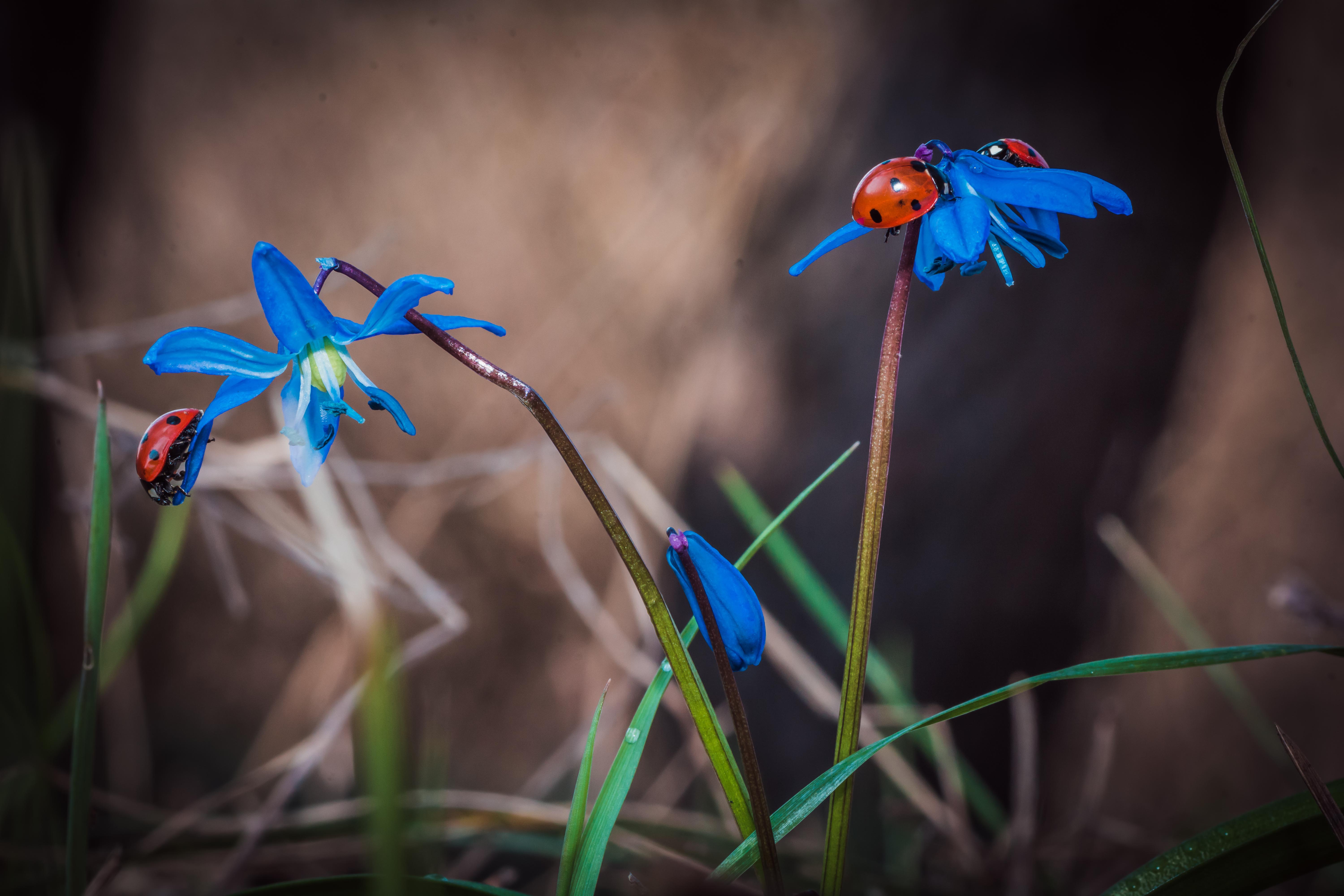 Красные божьи коровки на голубых весенних цветах - 6000x4000