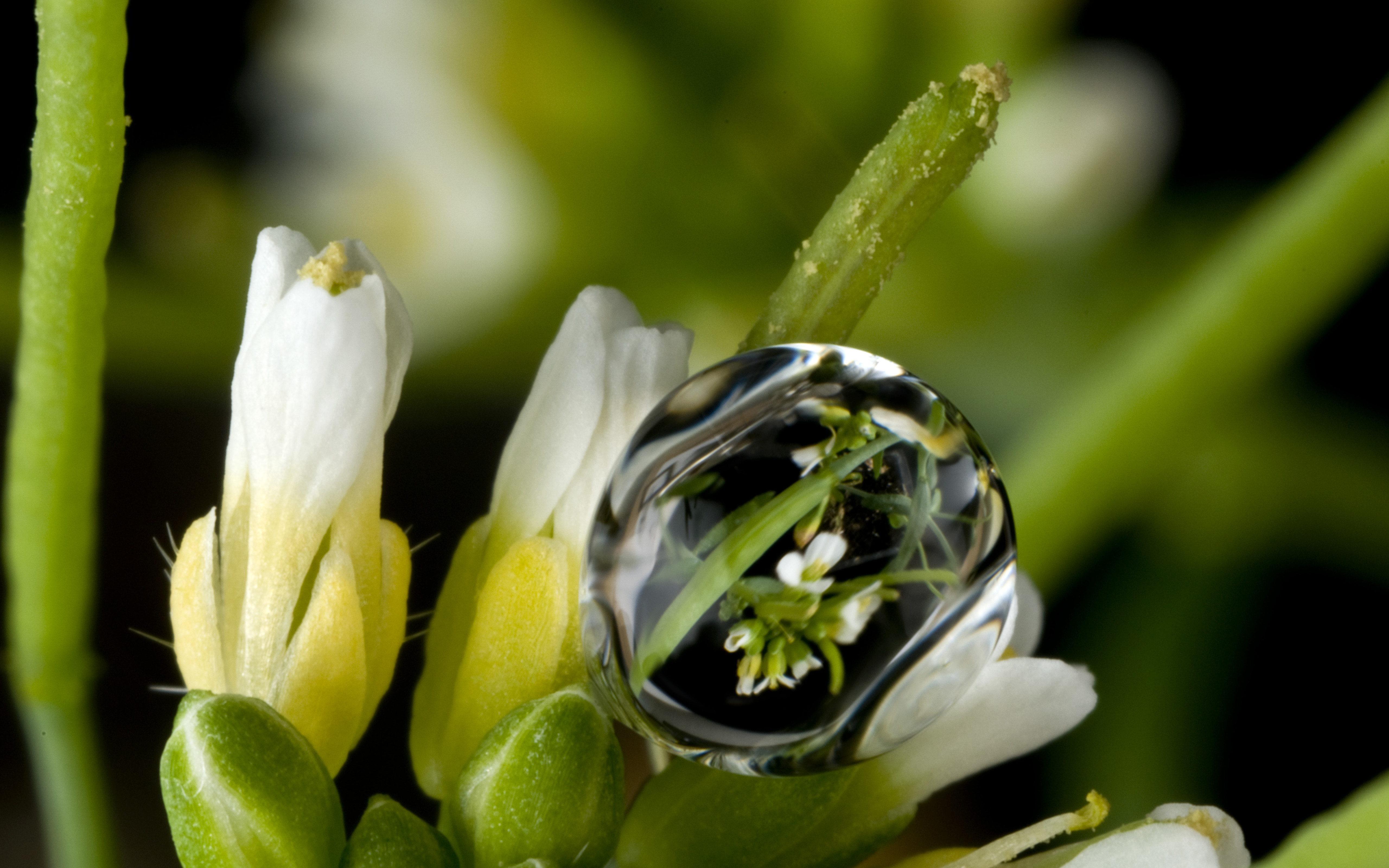 Обои: Капля воды на белом цветке крупным планом