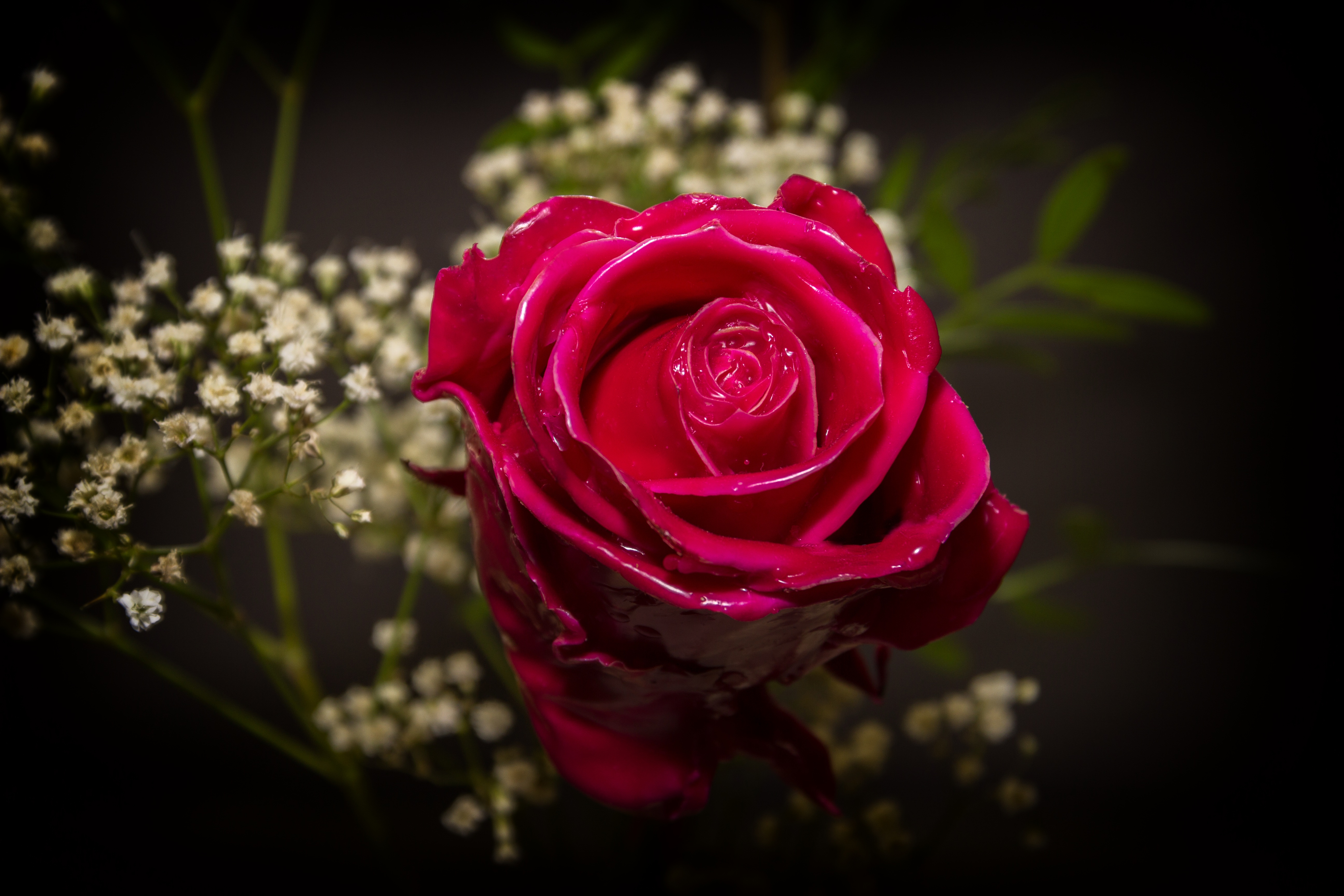 Красивая мокрая красная роза с белыми цветами - 5184x3456