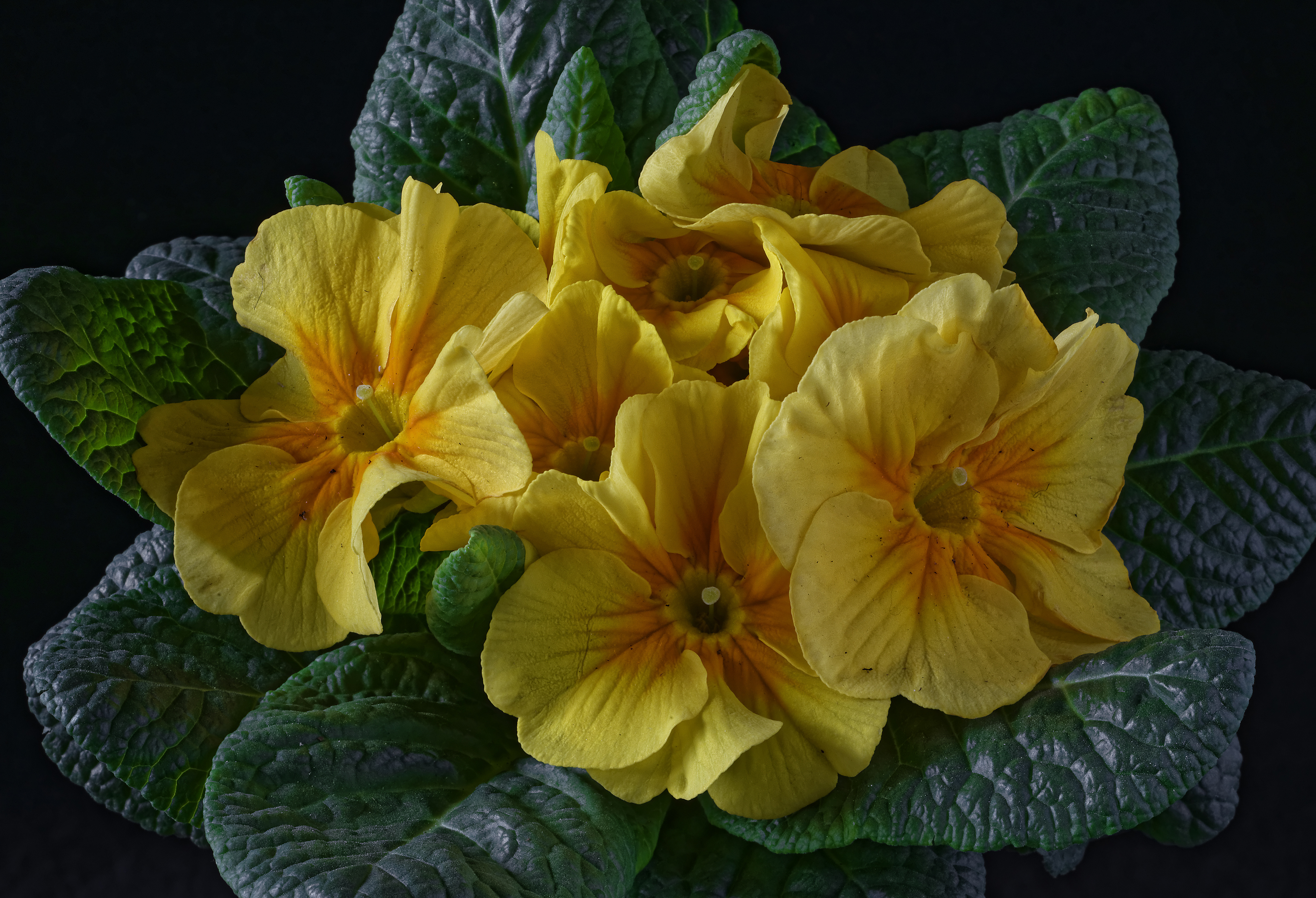 Желтый цветок примула с большими зелеными листьями - 4000x2730