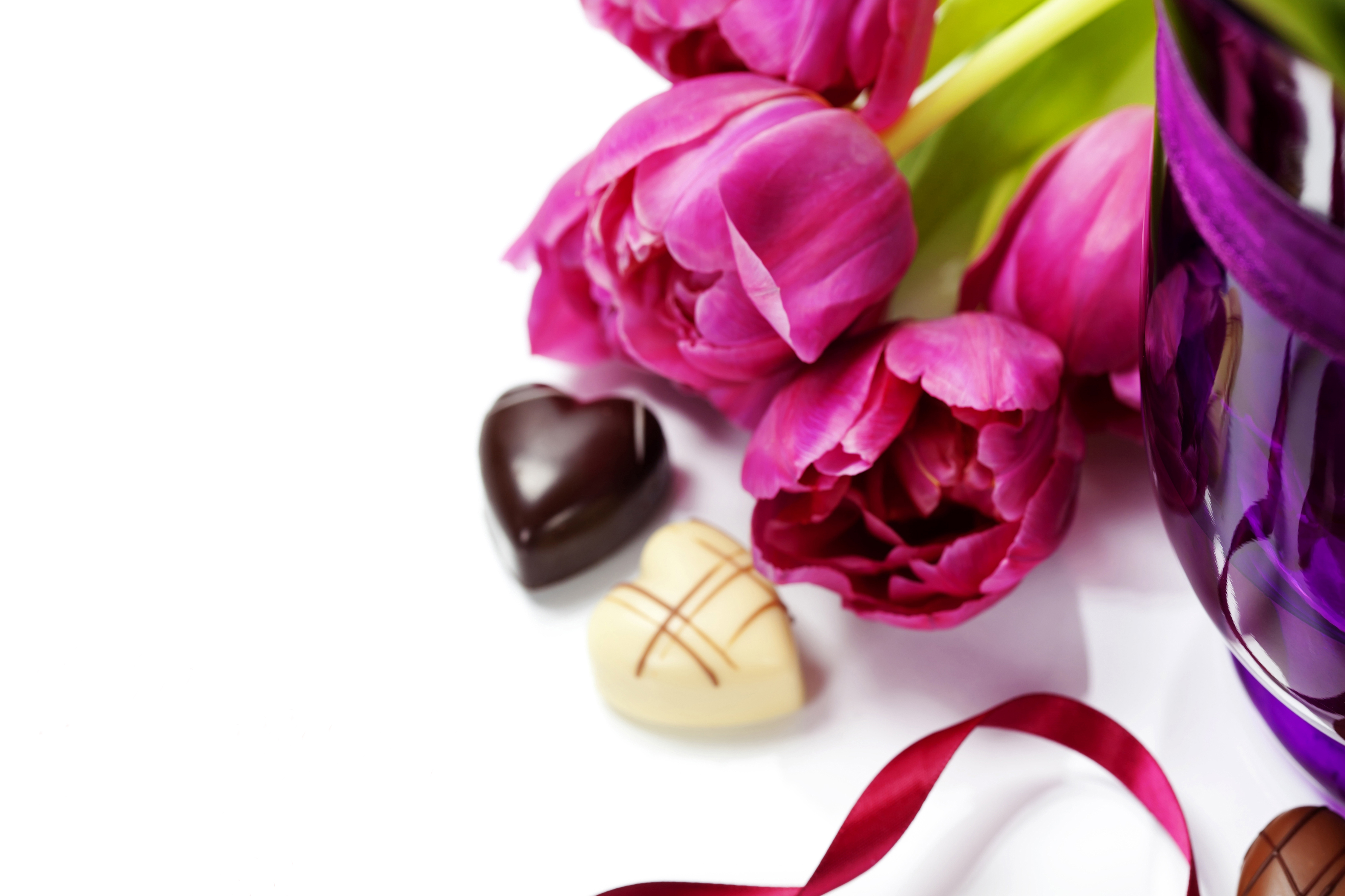 Тюльпаны на белом фоне с шоколадными конфетами - 4500x3000