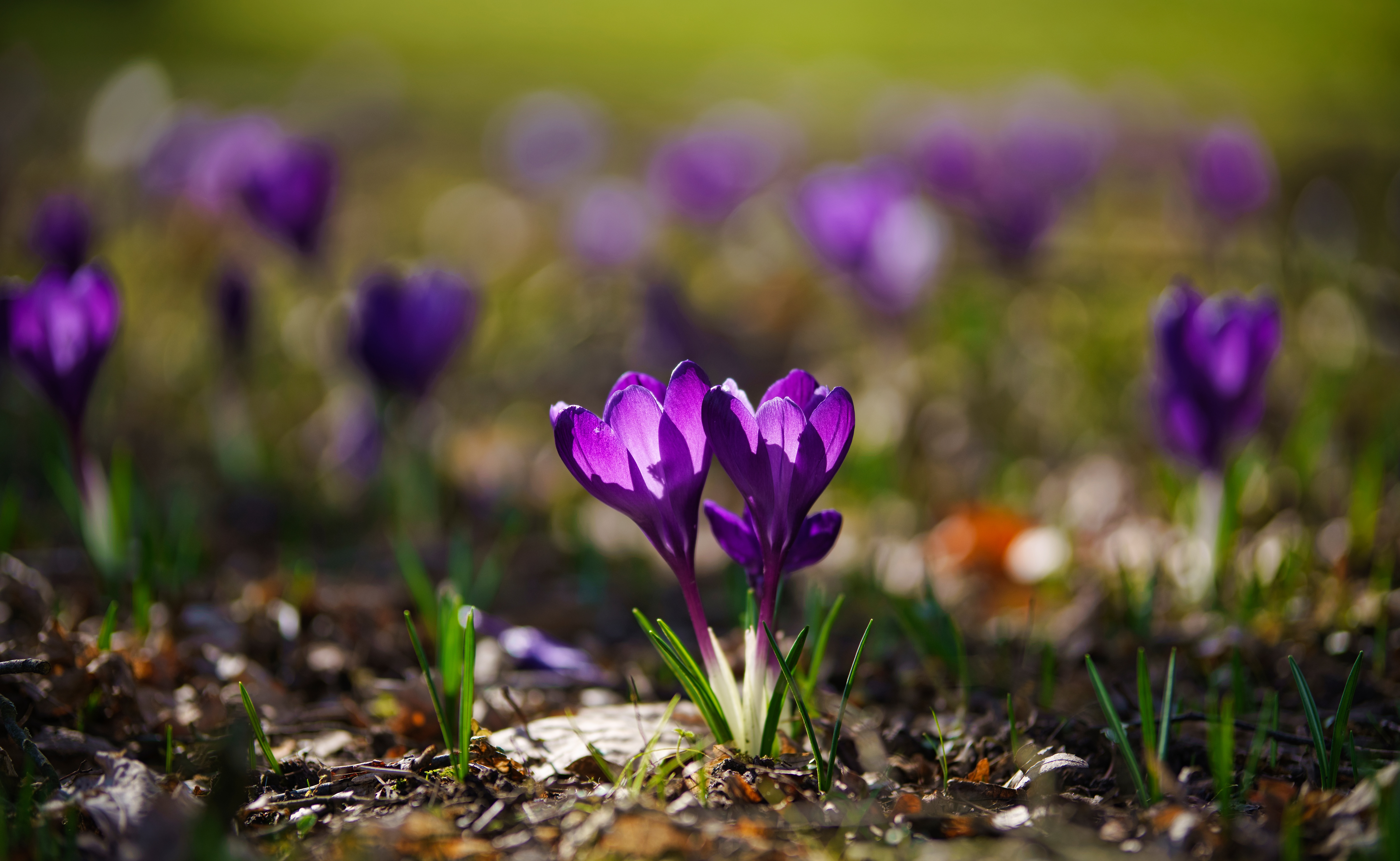 Обои: Два фиолетовых цветка крокуса в лучах солнца