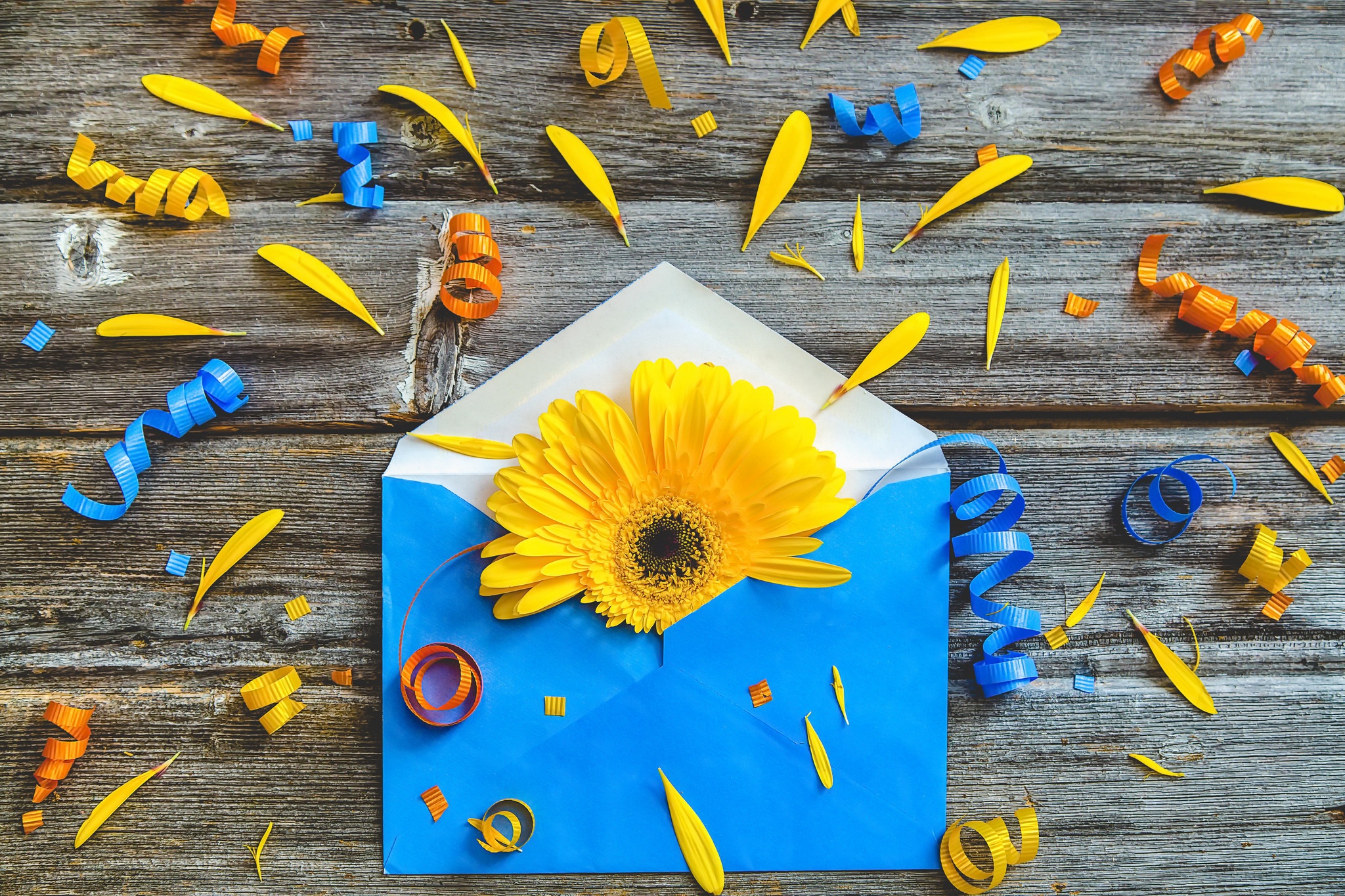 Синий конверт с желтым цветком гербер - 2048x1365