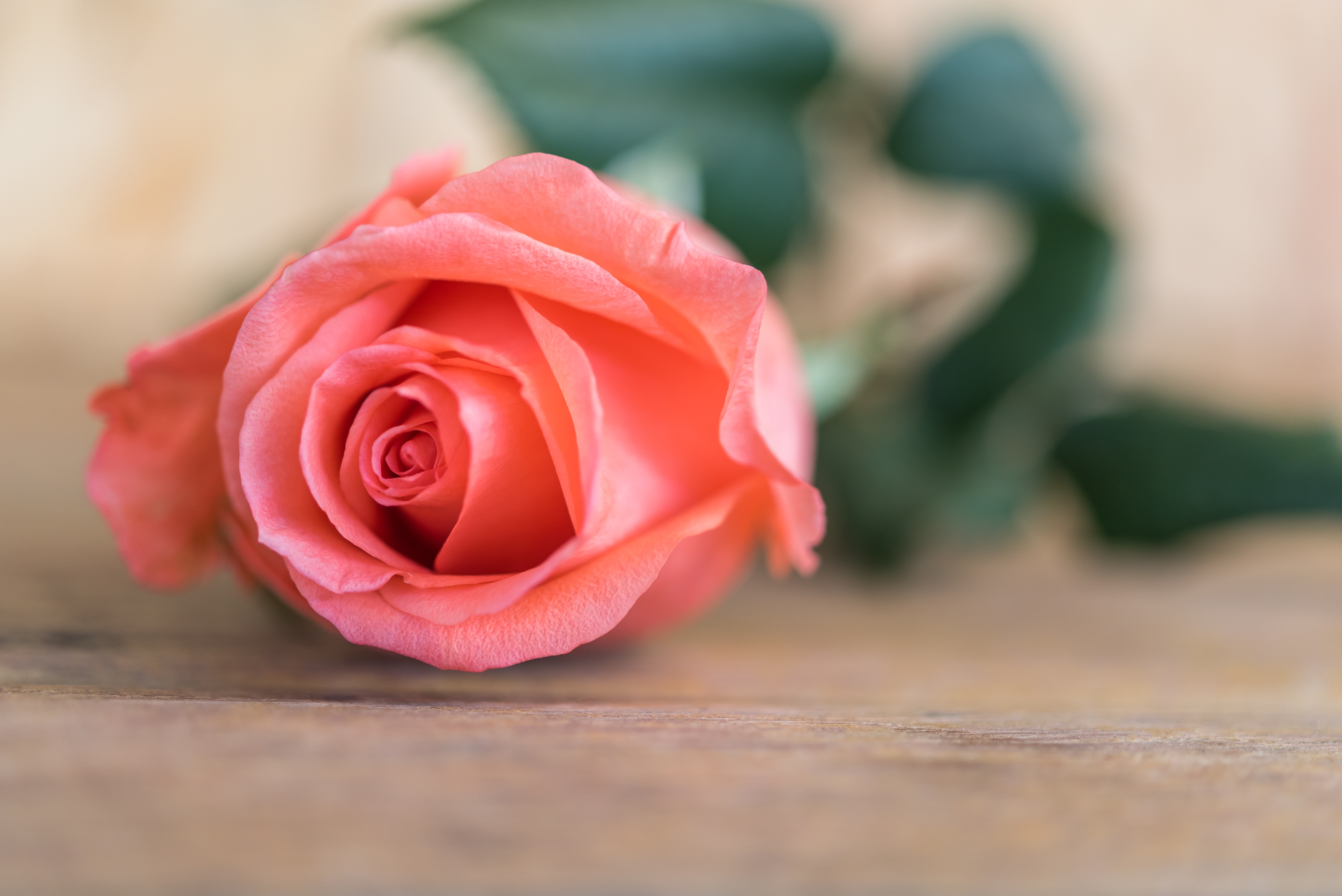 Розовая роза лежит на деревянном столе - 6016x4016