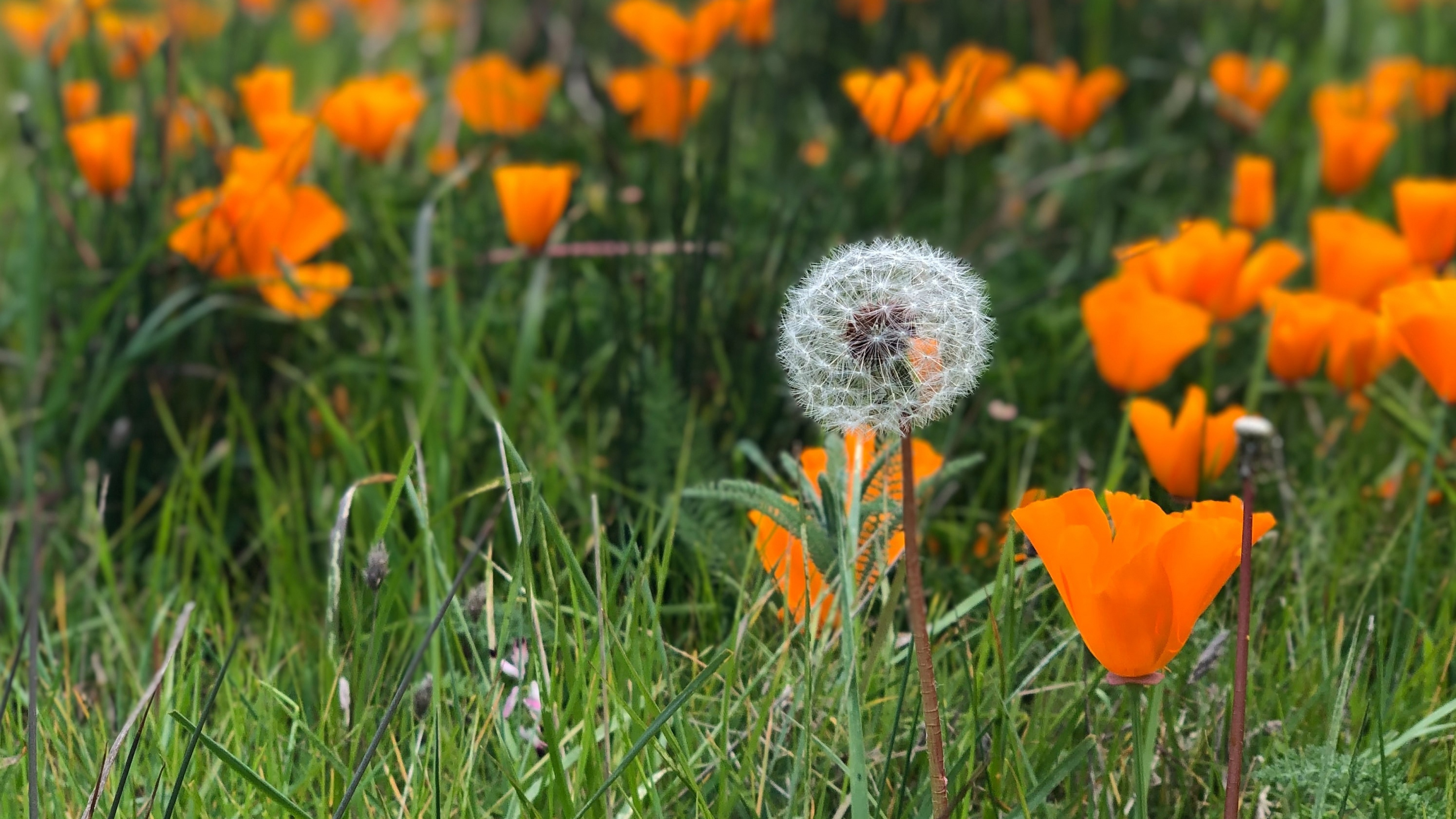 Оранжевые цветы эшшольции с белым одуванчиком - 3840x2160