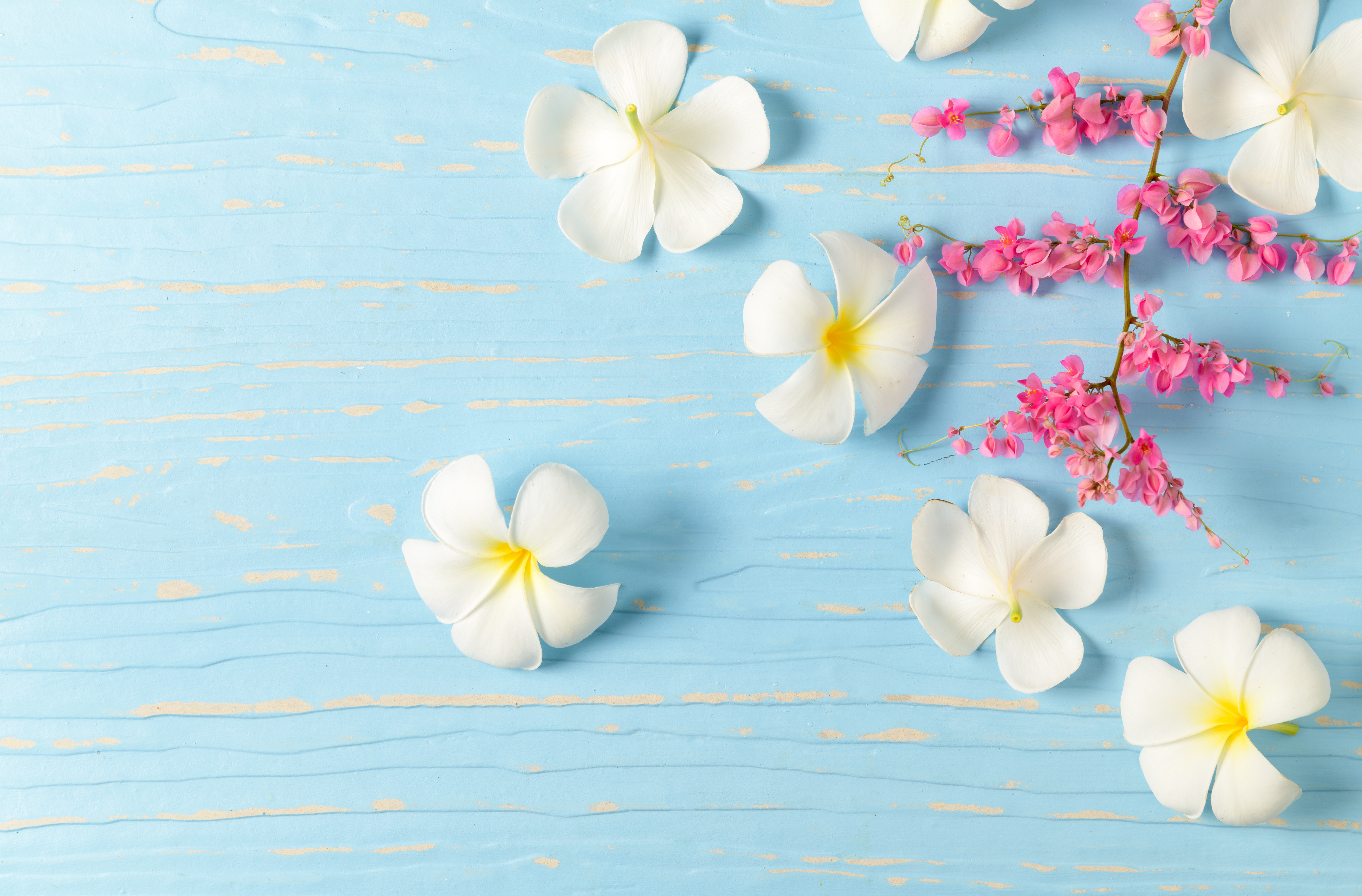 Белые цветы плюмерии на голубом фоне - 7800x5132