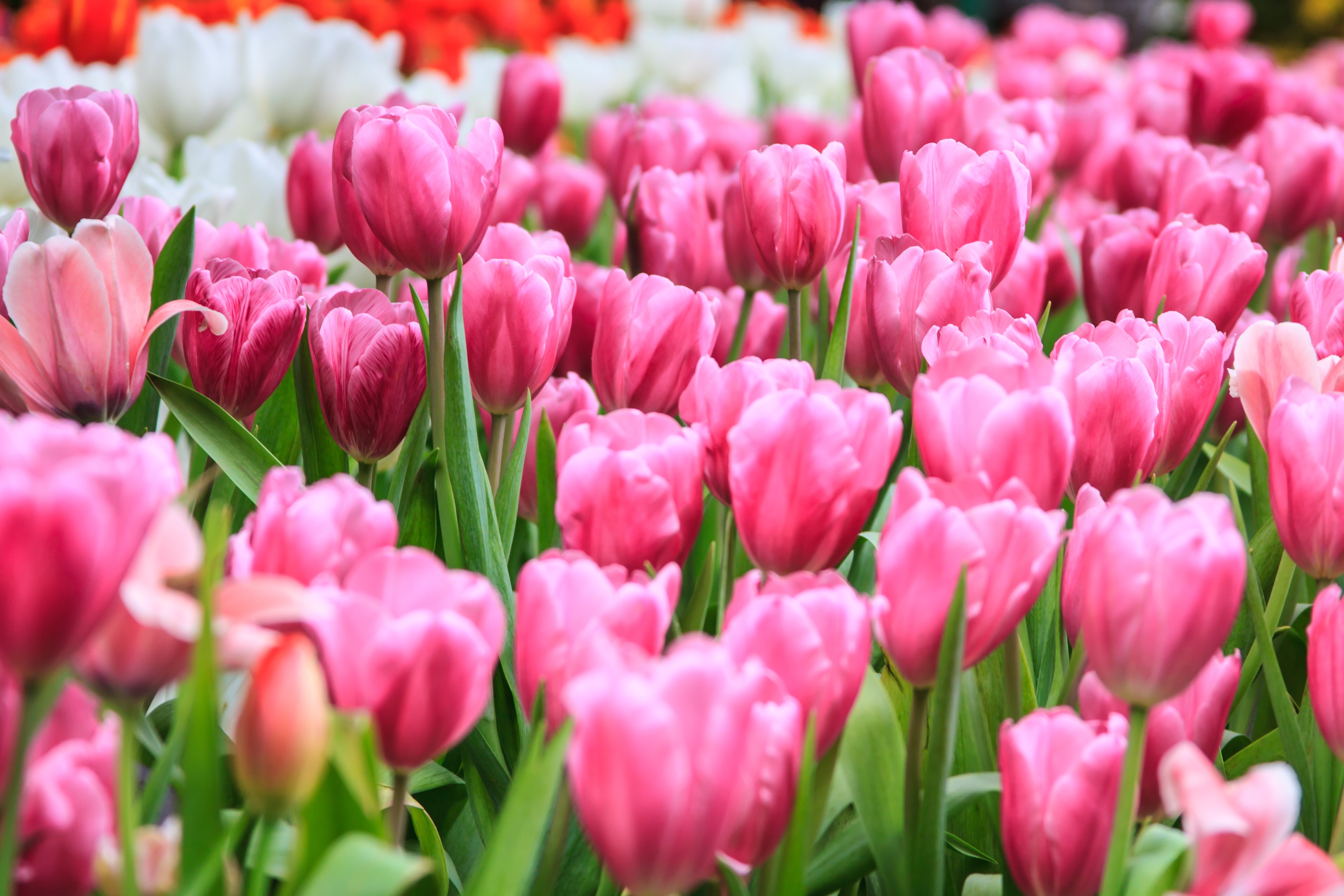 Много розовых весенних тюльпанов на клумбе - 4400x2933