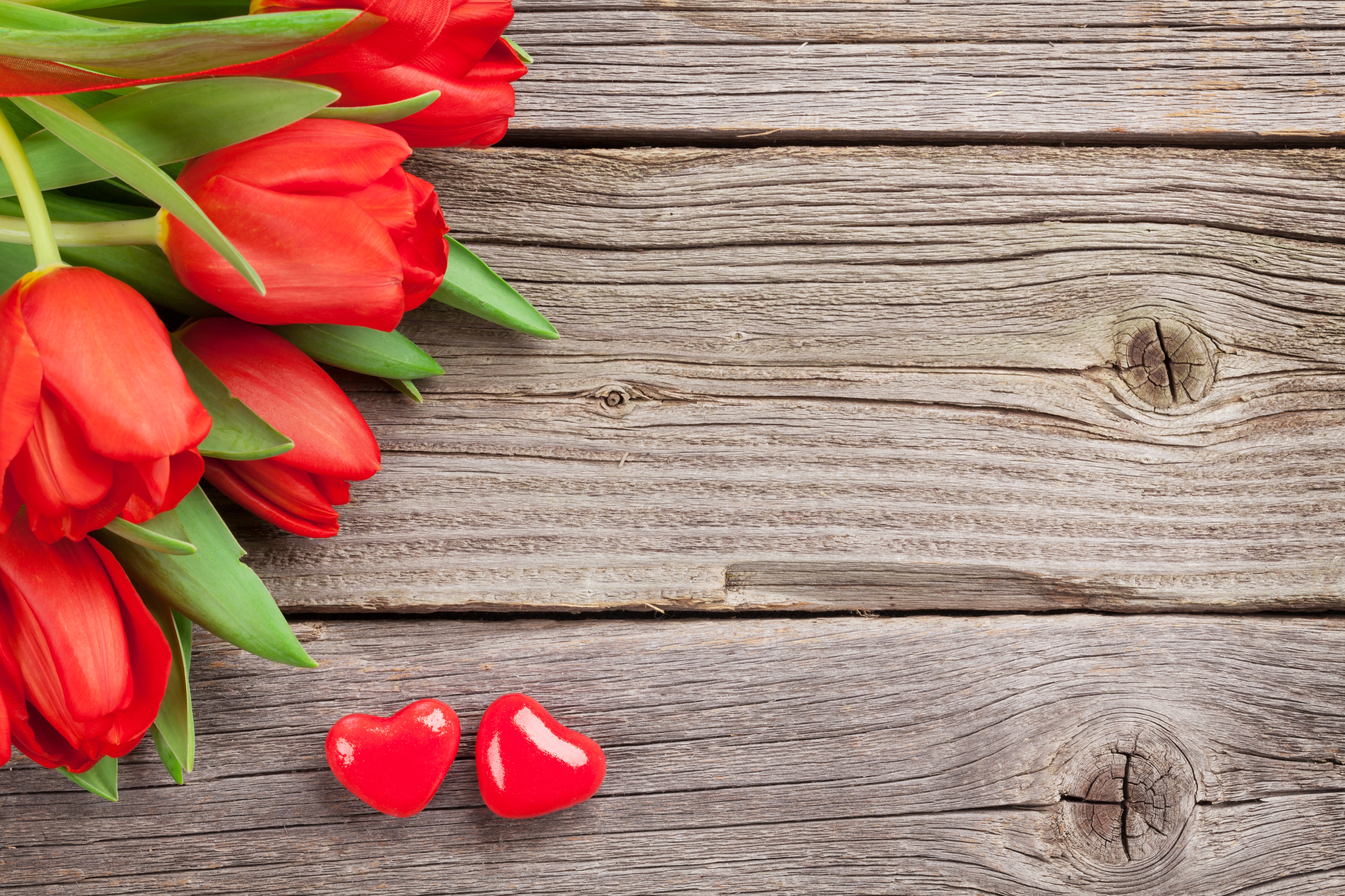 Красные тюльпаны на деревянном столе - 5469x3647