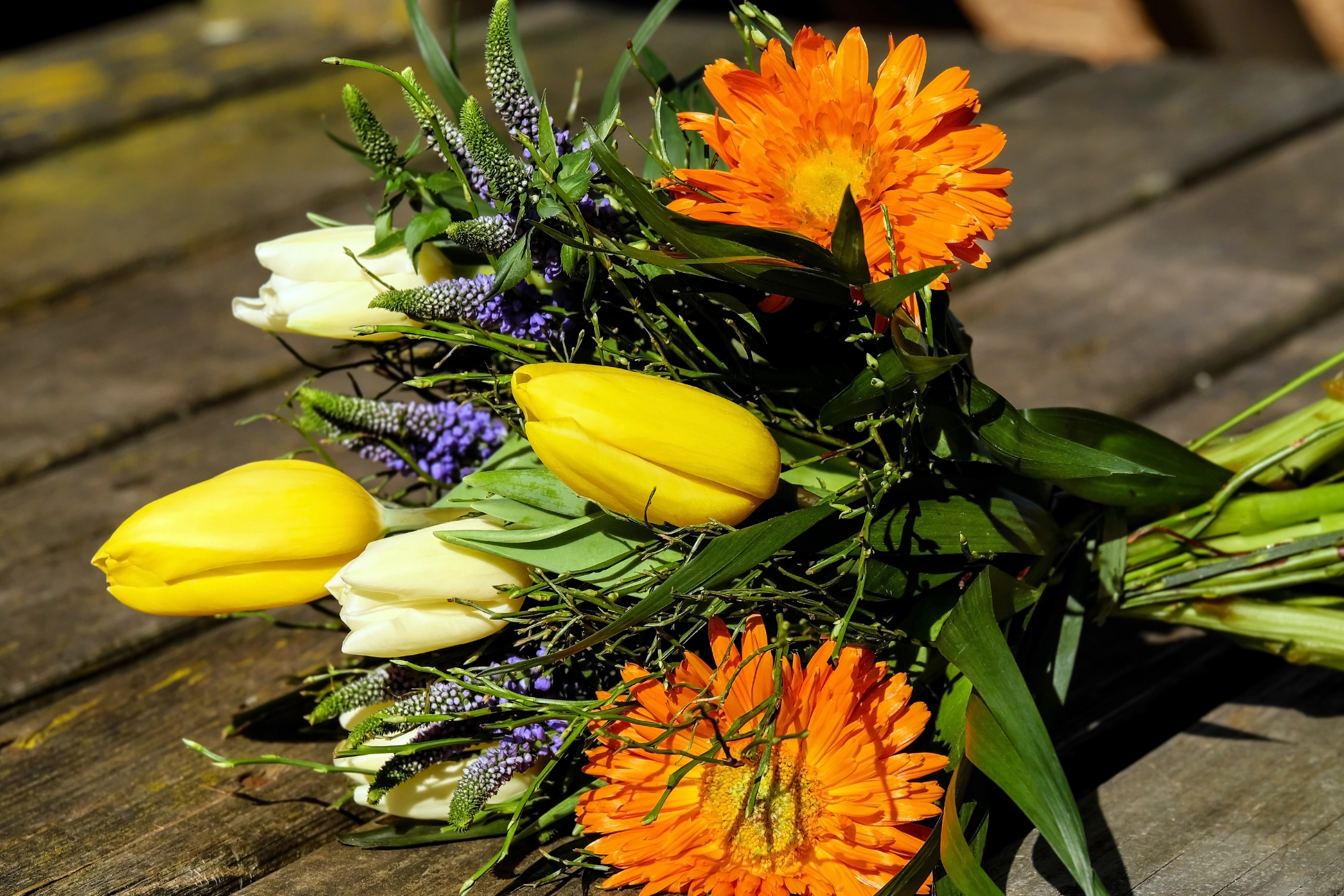 Цветы тюльпана с герберами на лавке - 4766x3177
