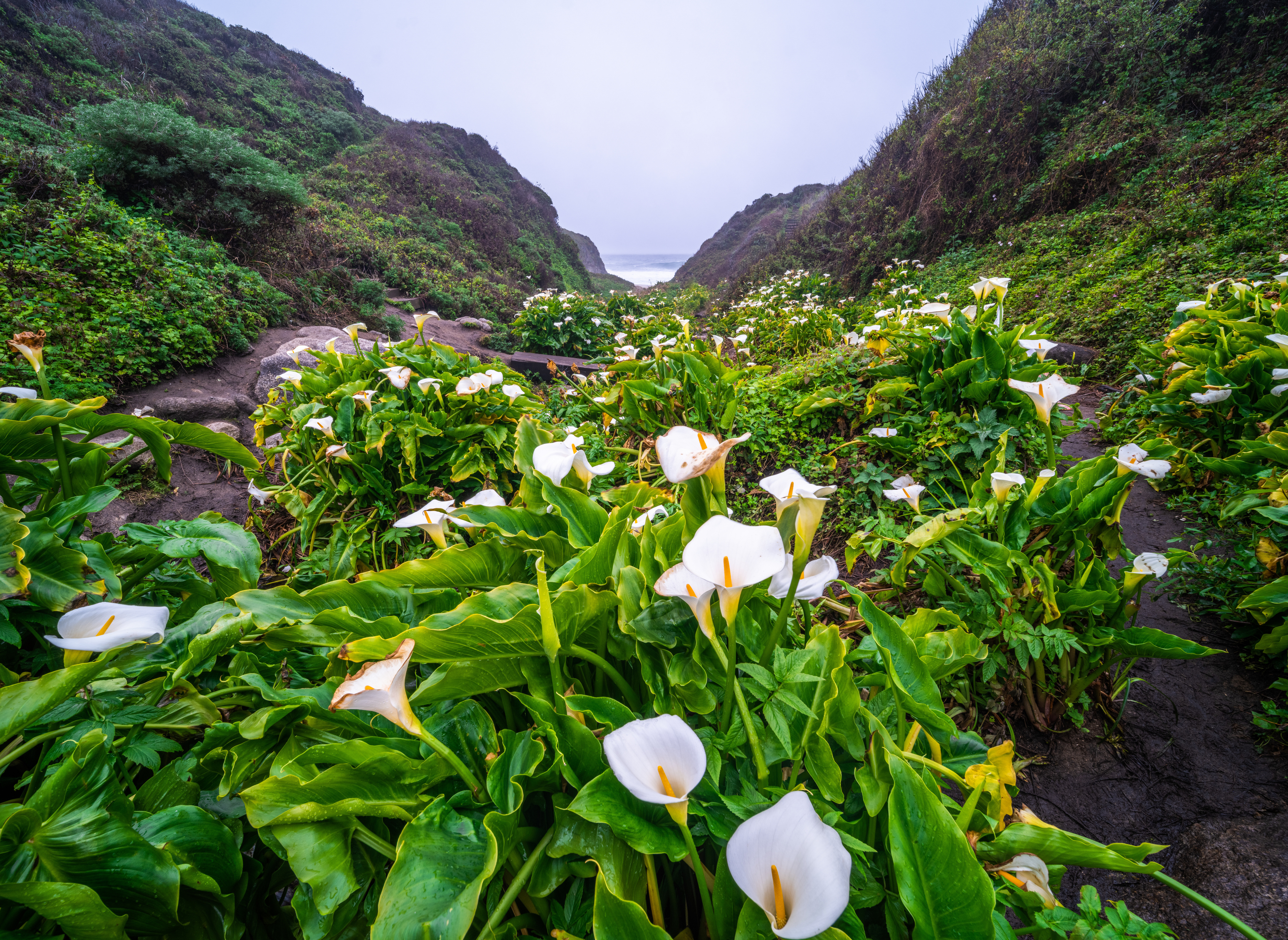 Белые цветы каллы с большими зелеными листьями - 6144x4487