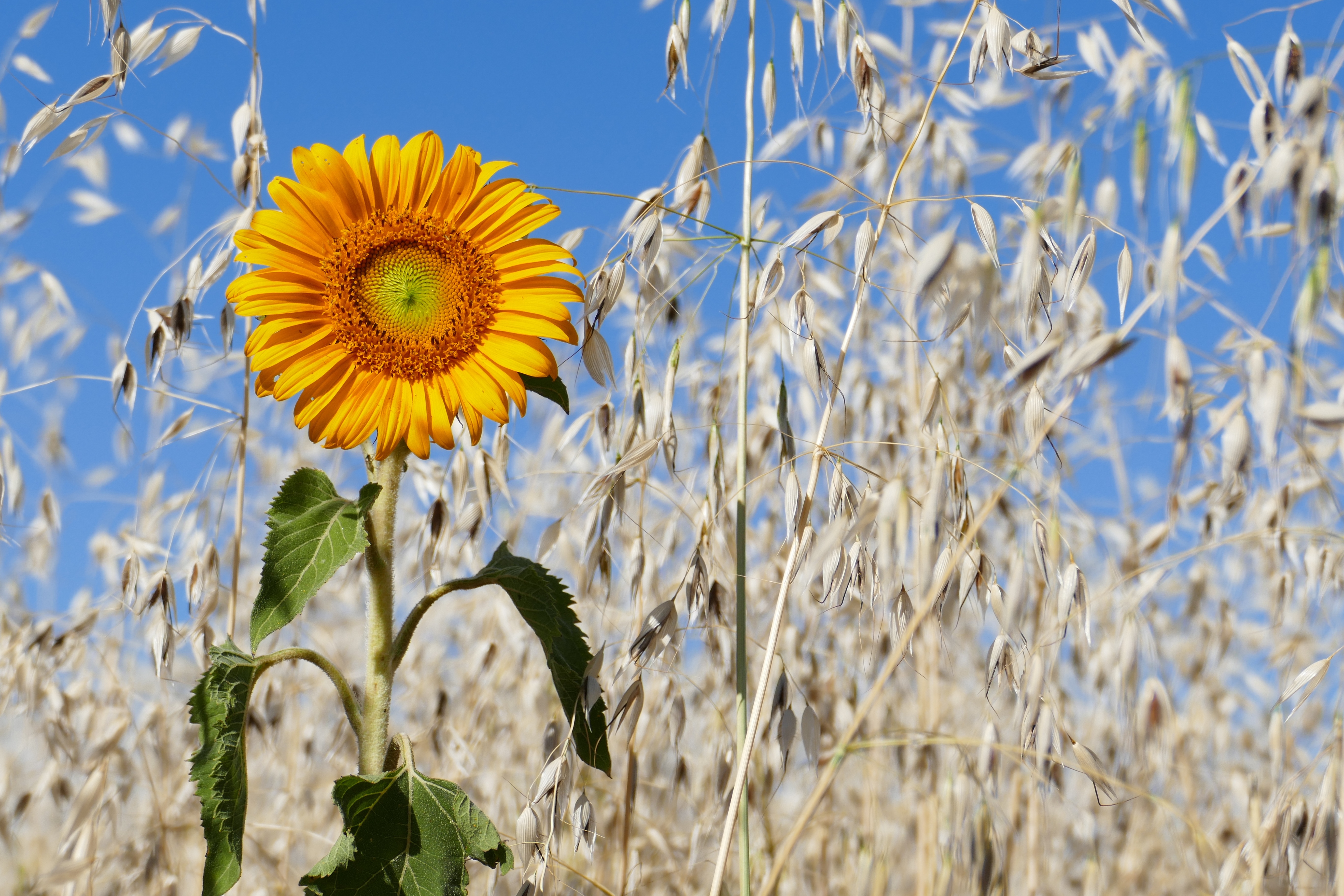 Желтый подсолнух на поле с колосьями - 5472x3648