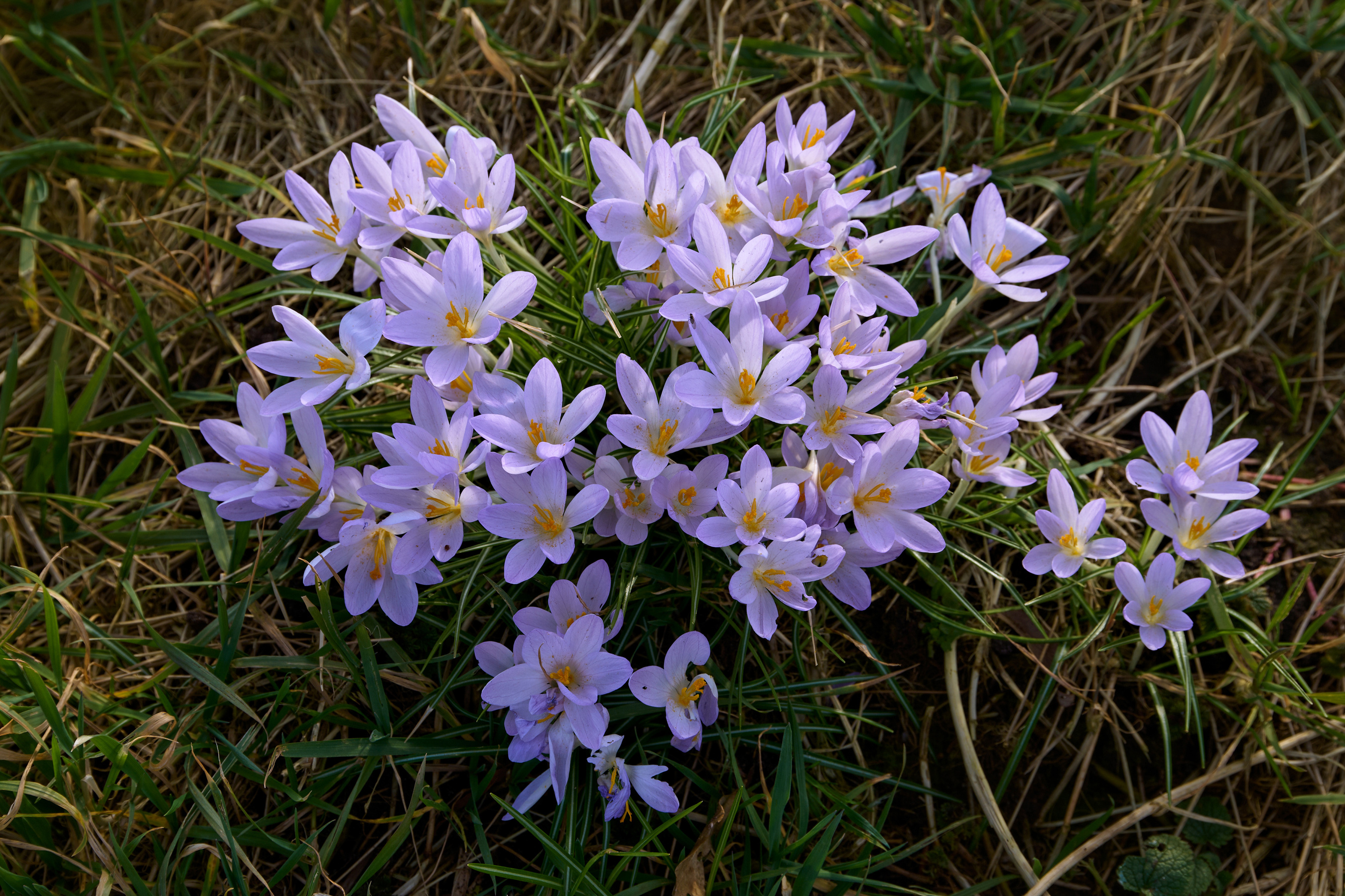 Много маленьких сиреневых крокусов на зеленой траве - 2700x1800