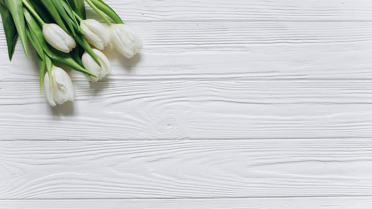 Белые тюльпаны в углу на белом деревянном фоне Обои для рабочего стола 1280x720