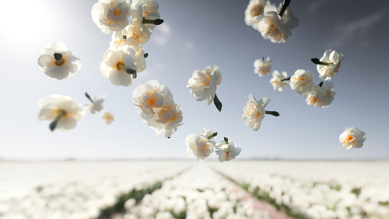 Белые цветы нарцисса летят над полем Обои для рабочего стола 1280x720