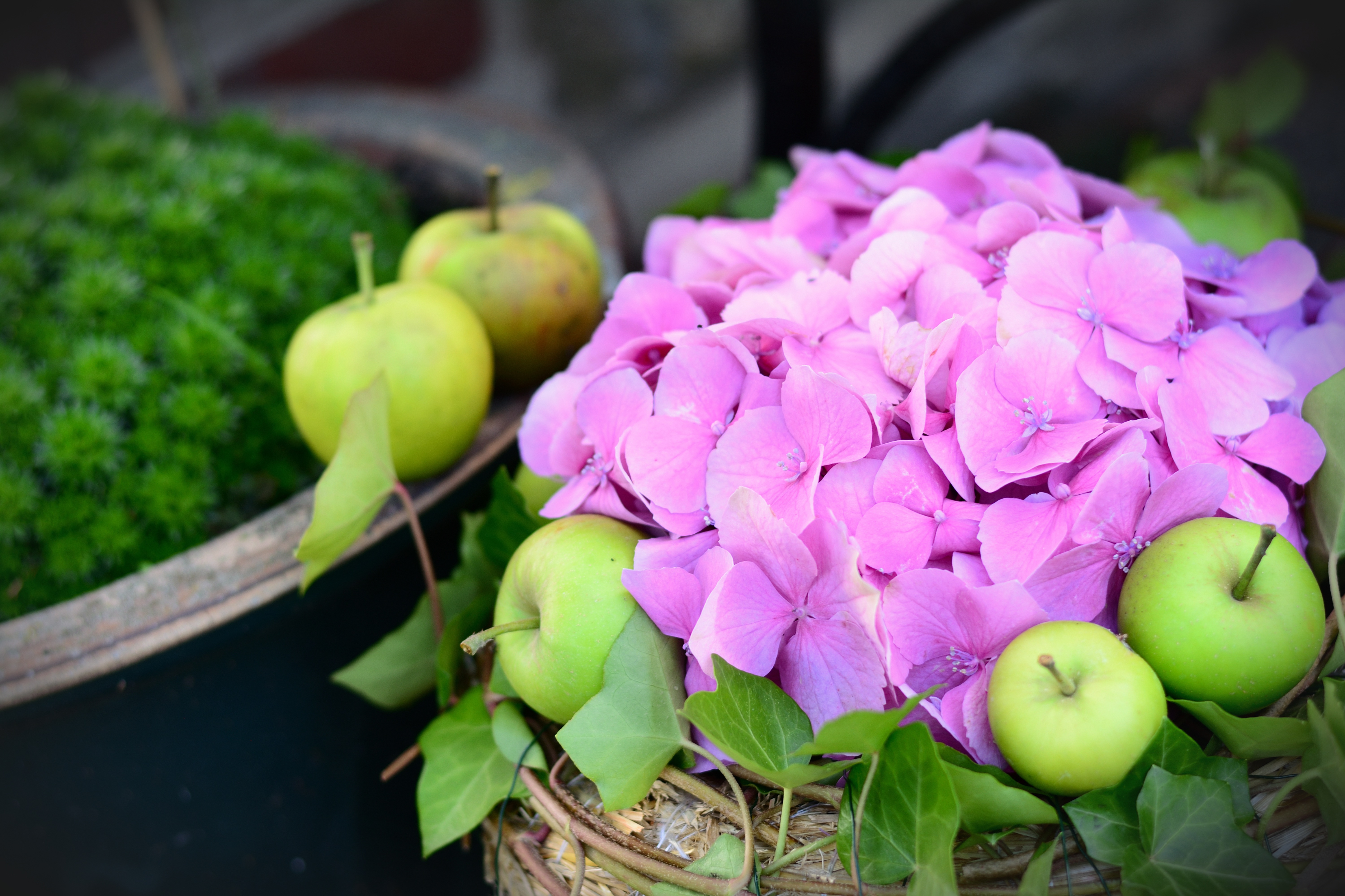 Розовые цветы гортензии с зелеными яблоками - 6000x4000