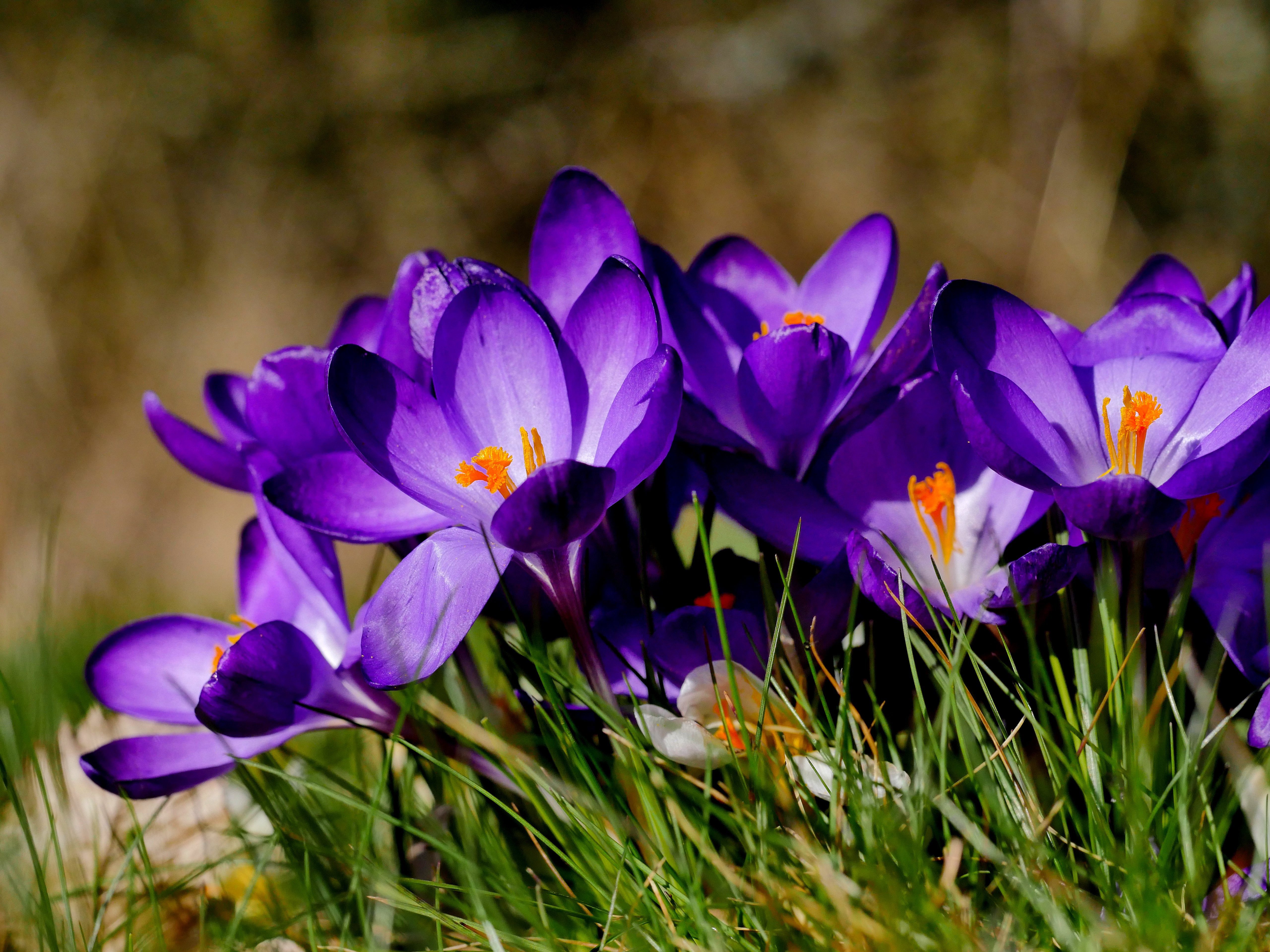 Обои: Маленькие сиреневые крокусы в зеленой траве