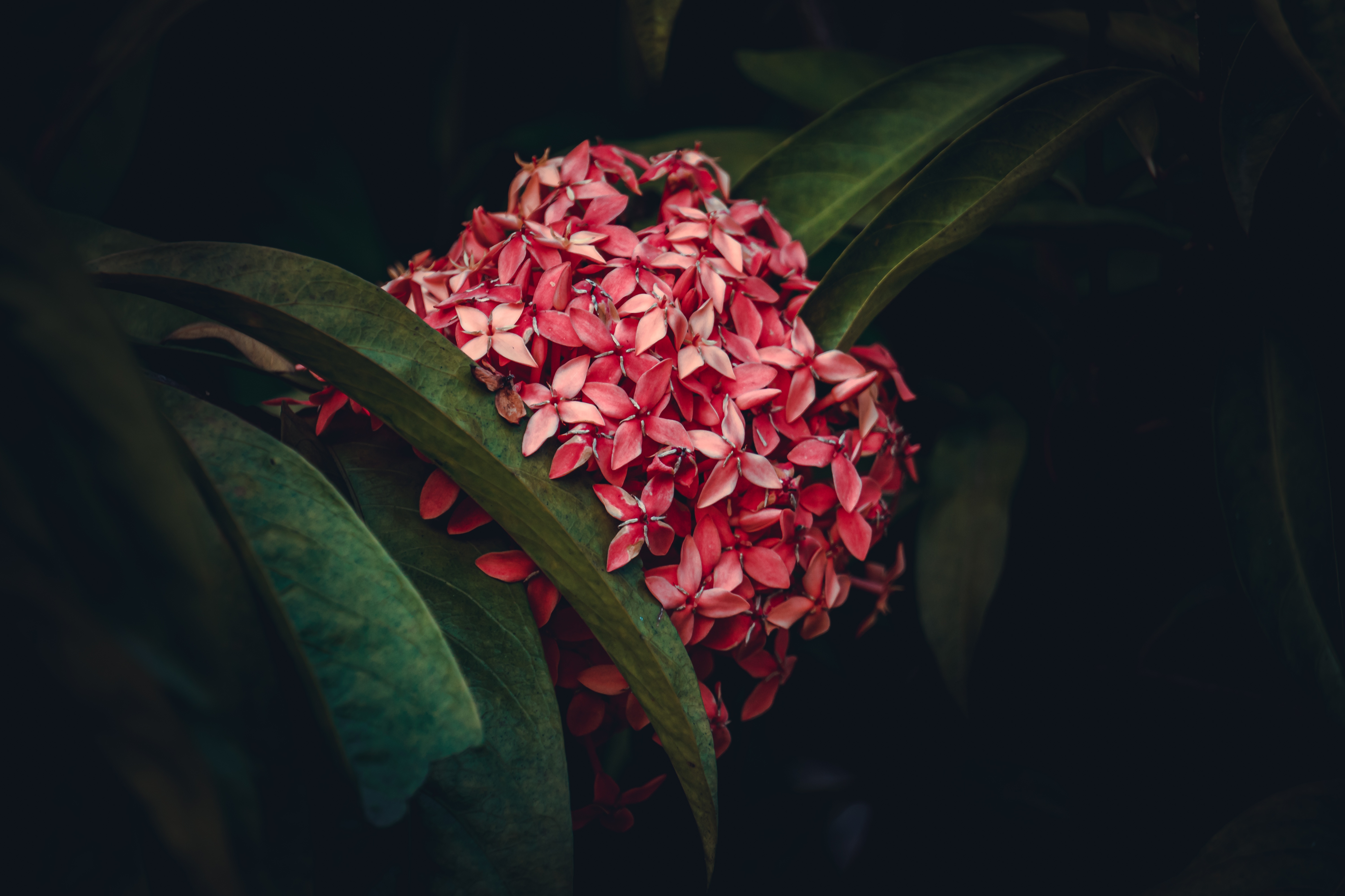 Красный экзотический цветок в зеленых листьях - 6000x4000