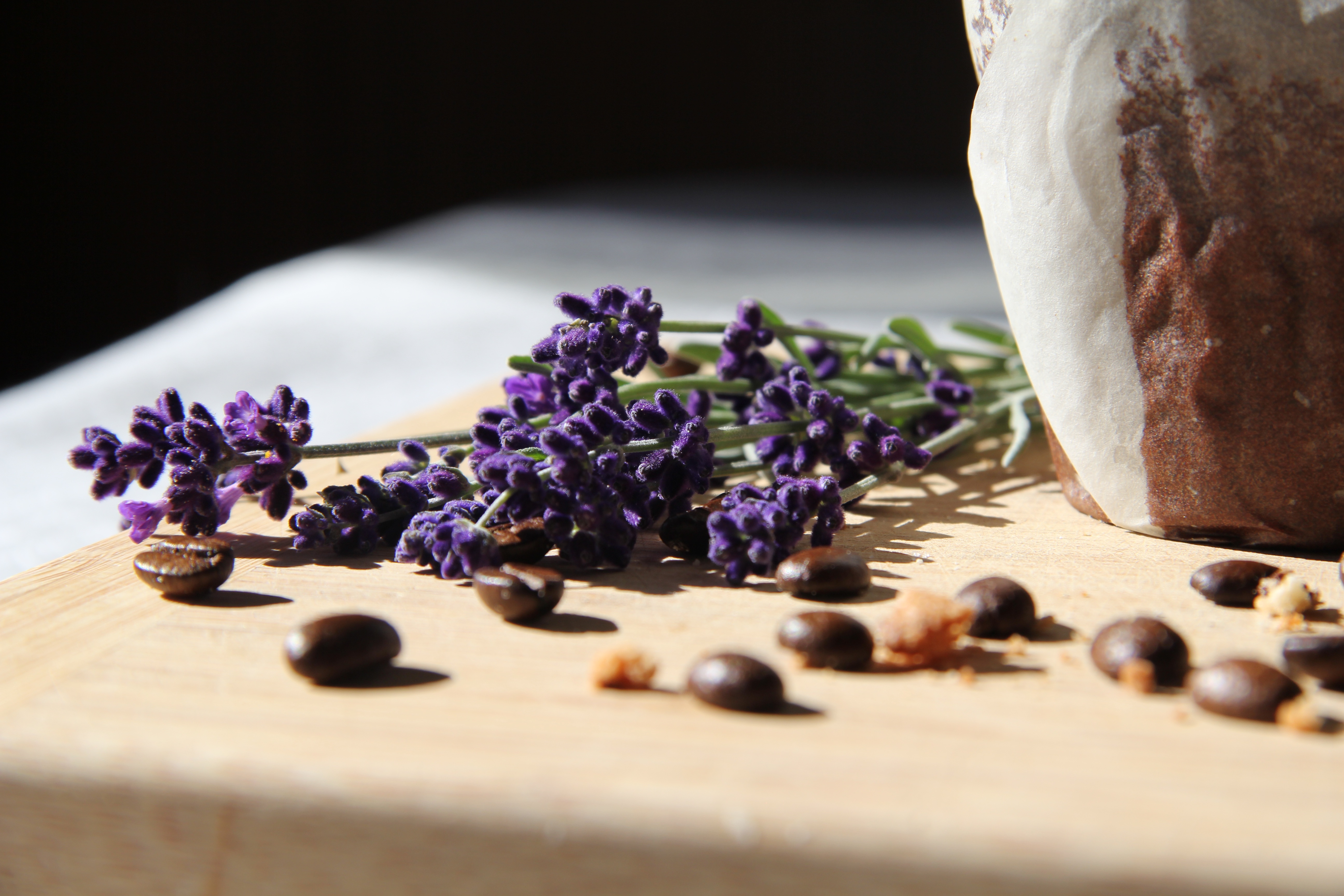 Синие цветы лаванды с зернами кофе - 5184x3456