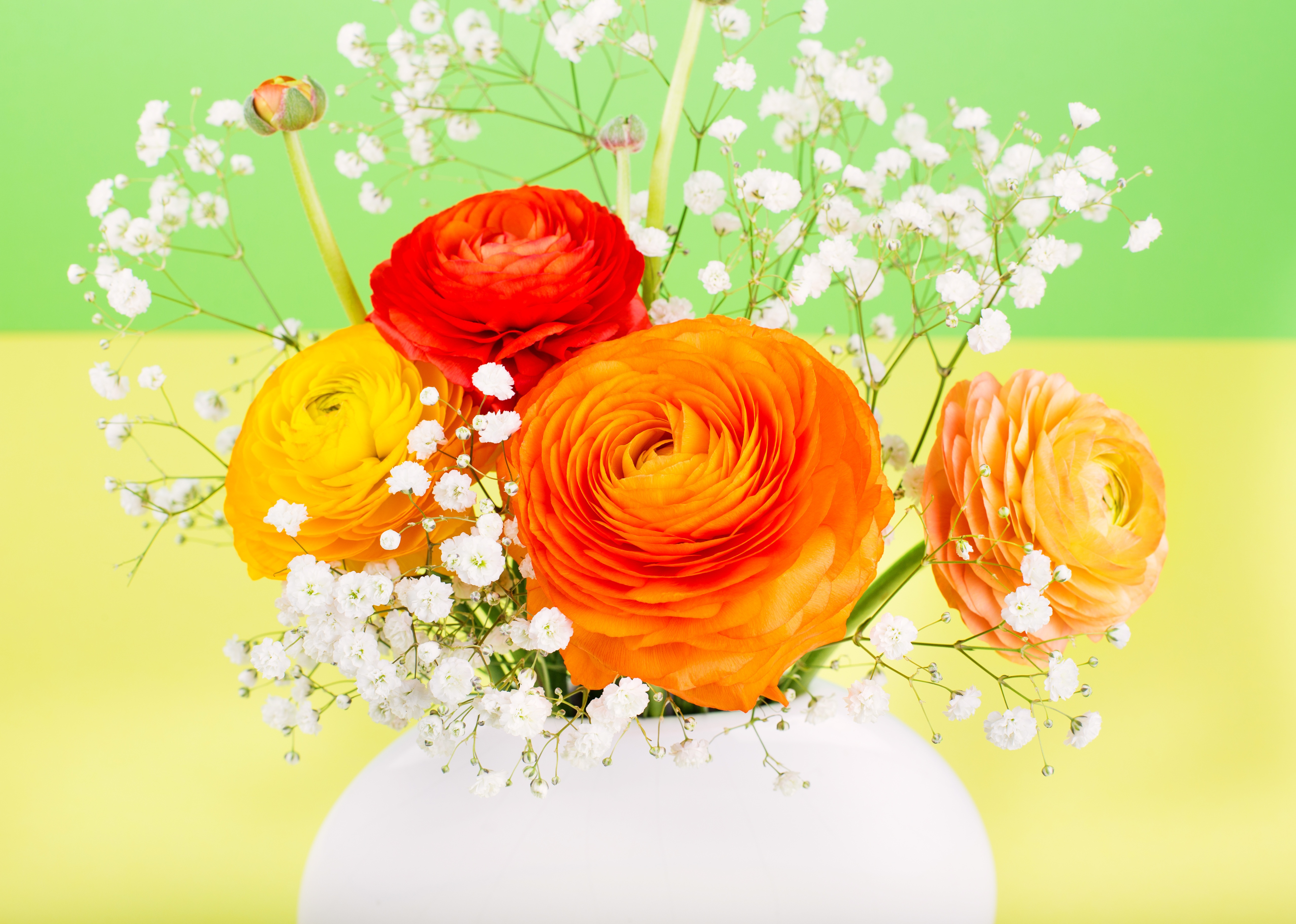 Оранжевые лютики с белыми цветами гипсофилы - 5118x3648