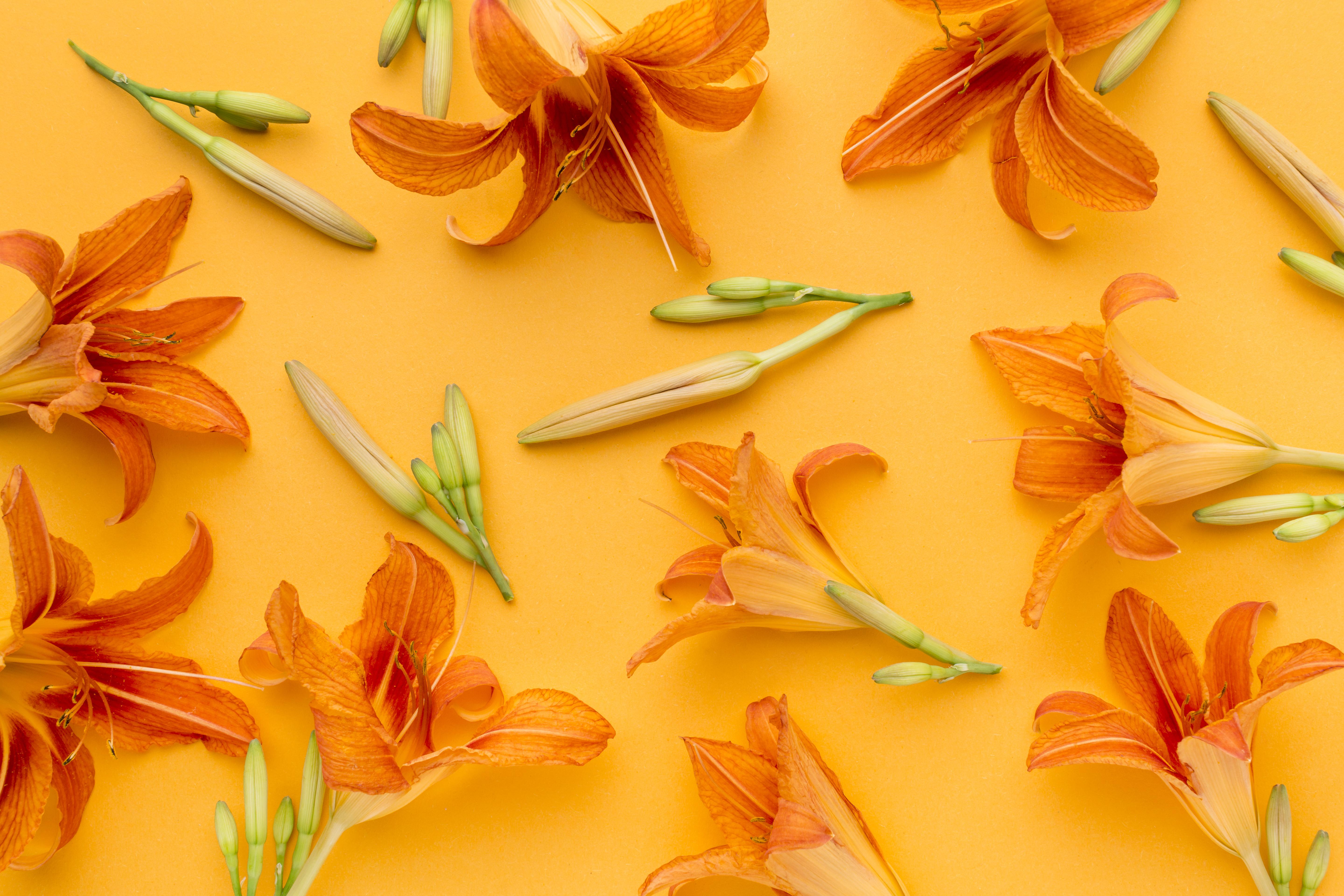 Оранжевые цветы лилейника на желтом фоне - 5760x3840