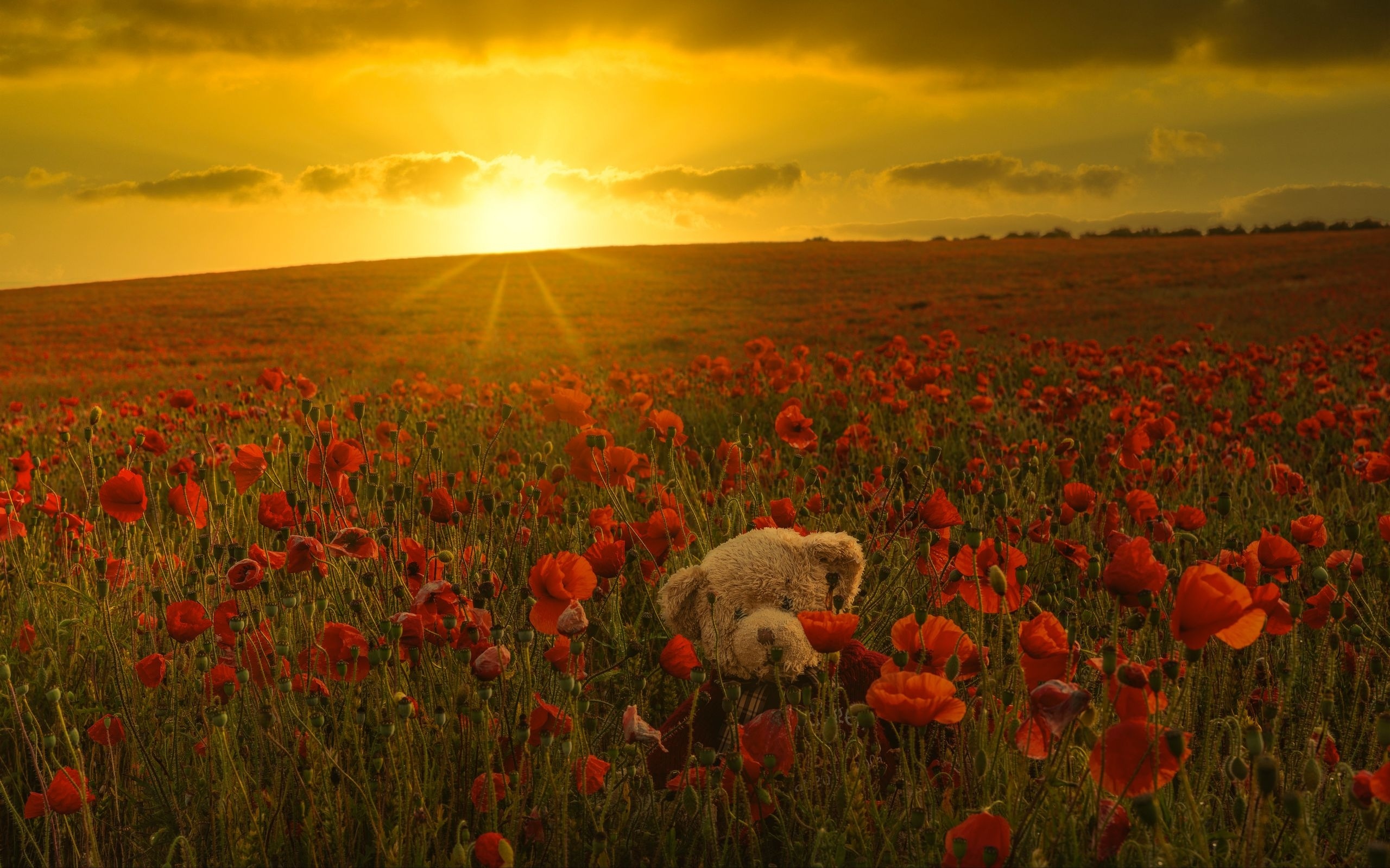 Игрушечный медвежонок на поле с красными маками в лучах солнца - 2560x1600