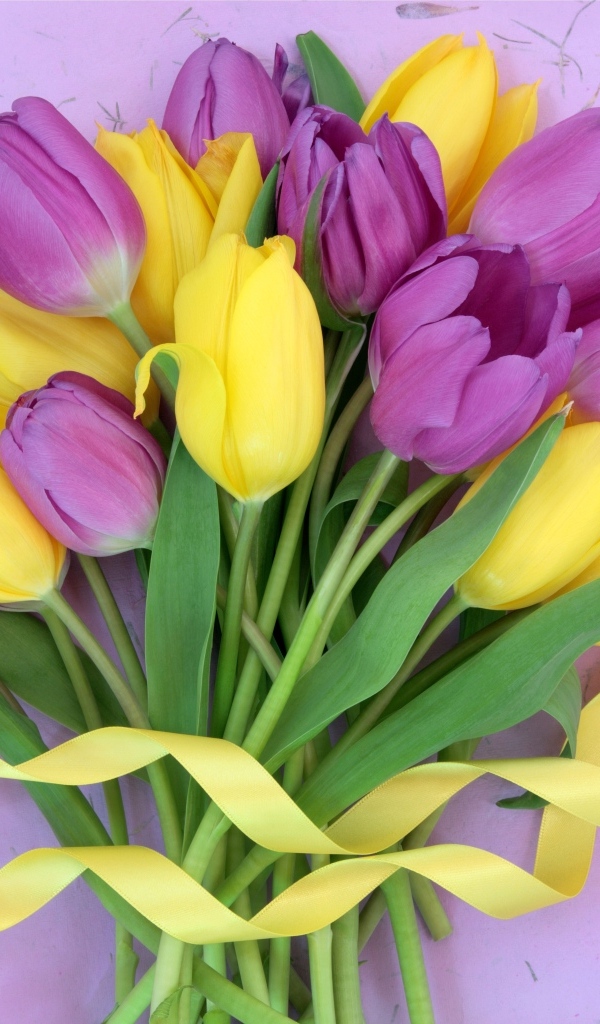 Желтые и сиреневые тюльпаны с лентой Обои для рабочего стола 600x1024