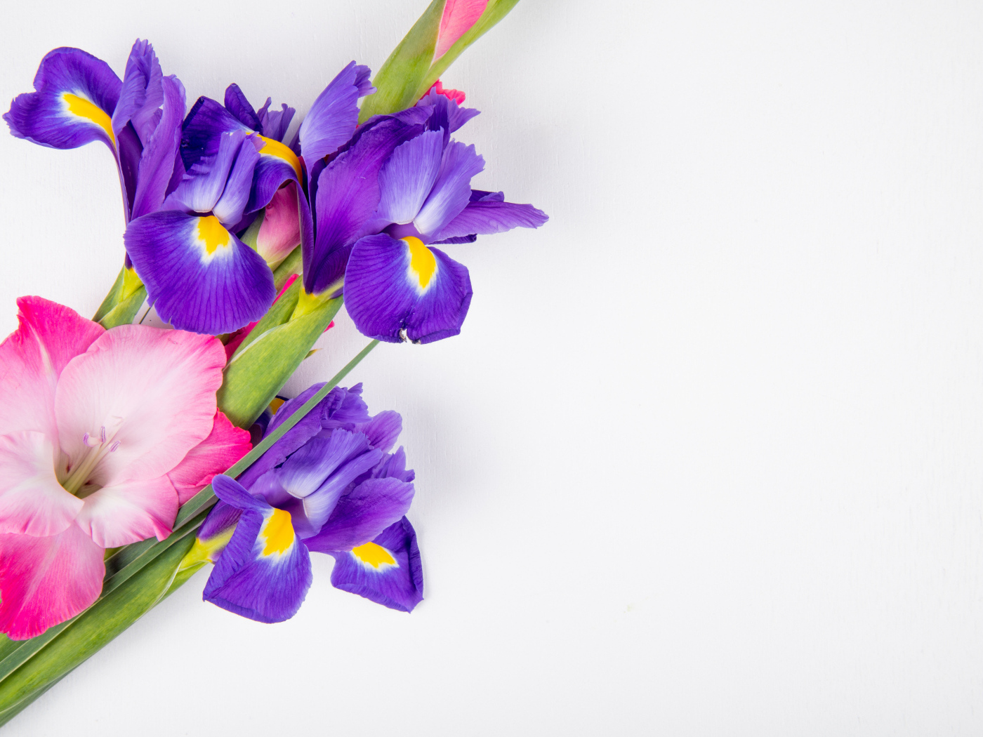 Розовые гладиолусы и ирисы на белом Обои для рабочего стола 1400x1050