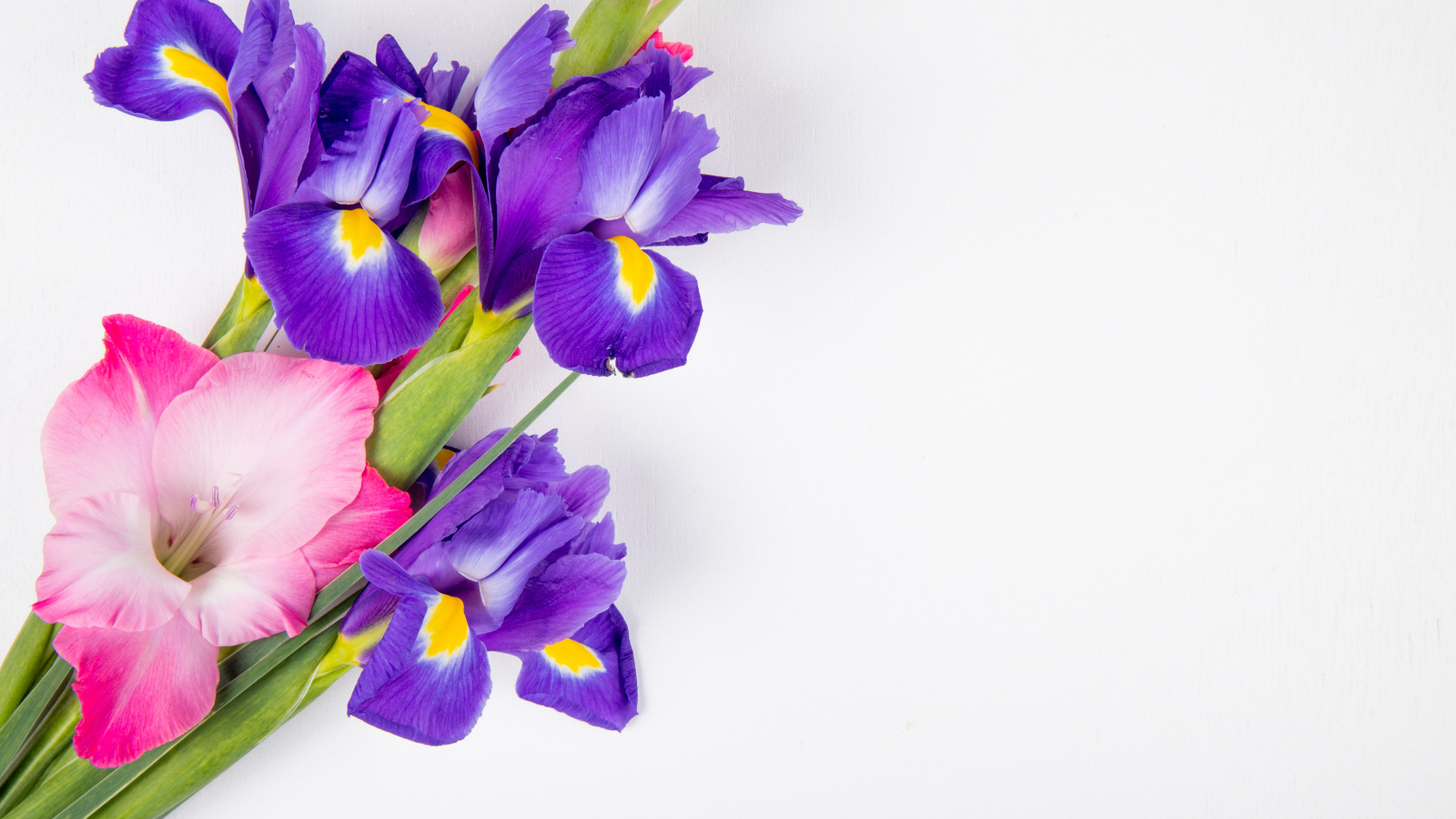Розовые гладиолусы и ирисы на белом Обои для рабочего стола 1600x900