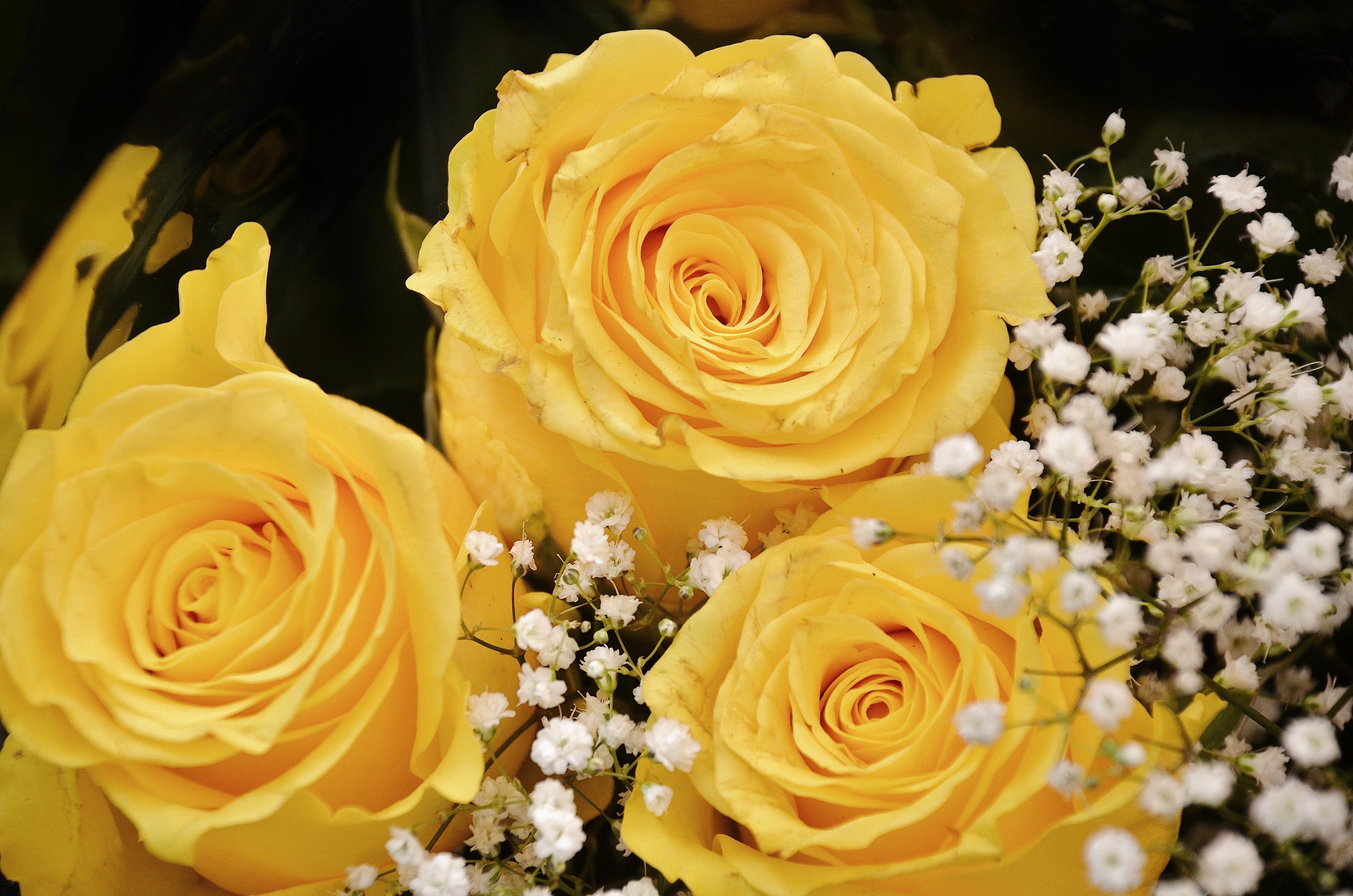Желтые розы с белыми цветами гипсофилы - 4928x3264