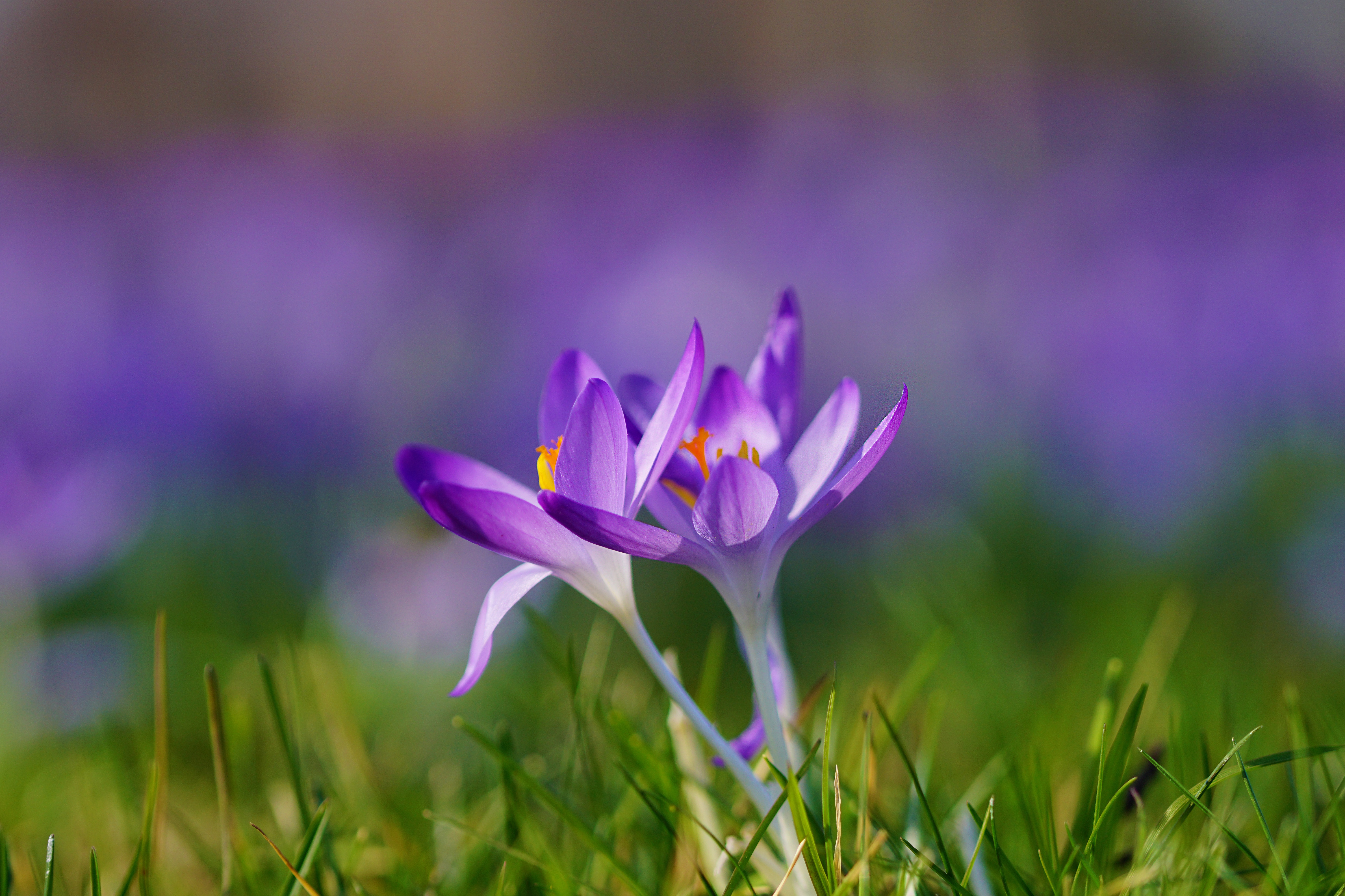 Обои: Весенние фиолетовые маленькие первоцветы крокусы