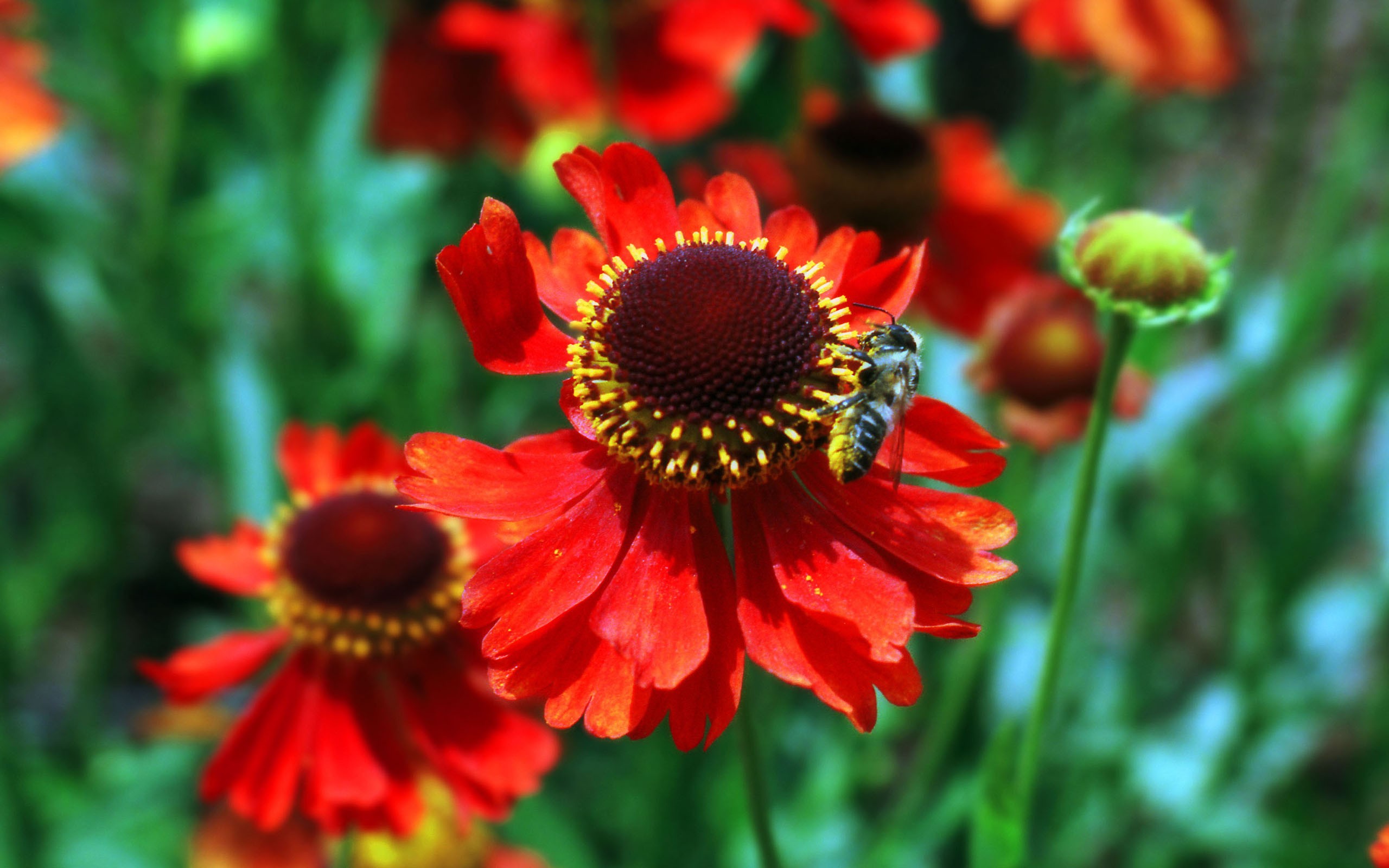 Красные цветы и пчела - 2560x1600