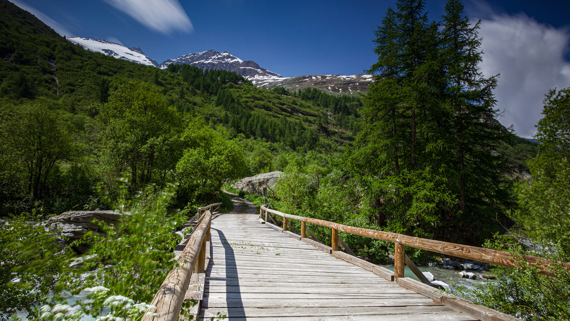 Большой деревянный мост у гор Обои для рабочего стола 1920x1080