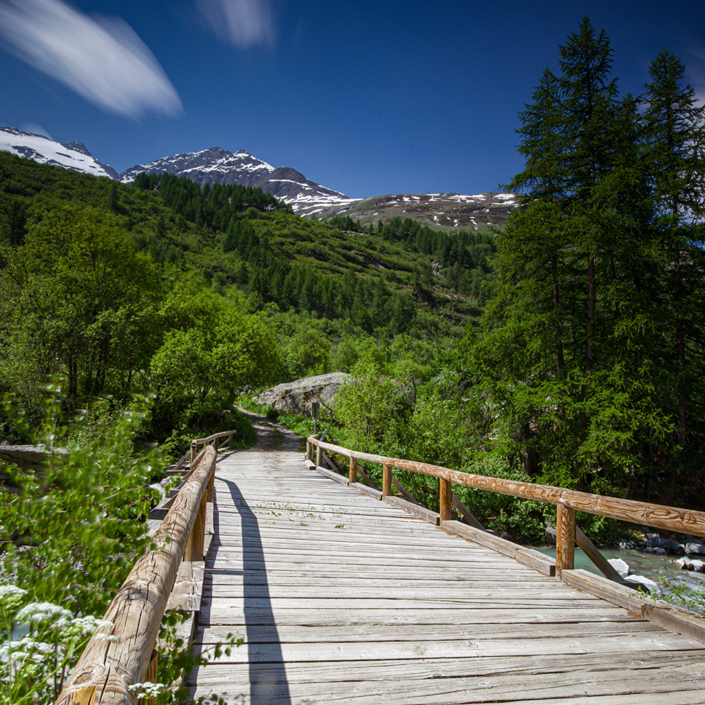 Большой деревянный мост у гор Обои для рабочего стола 1024x1024