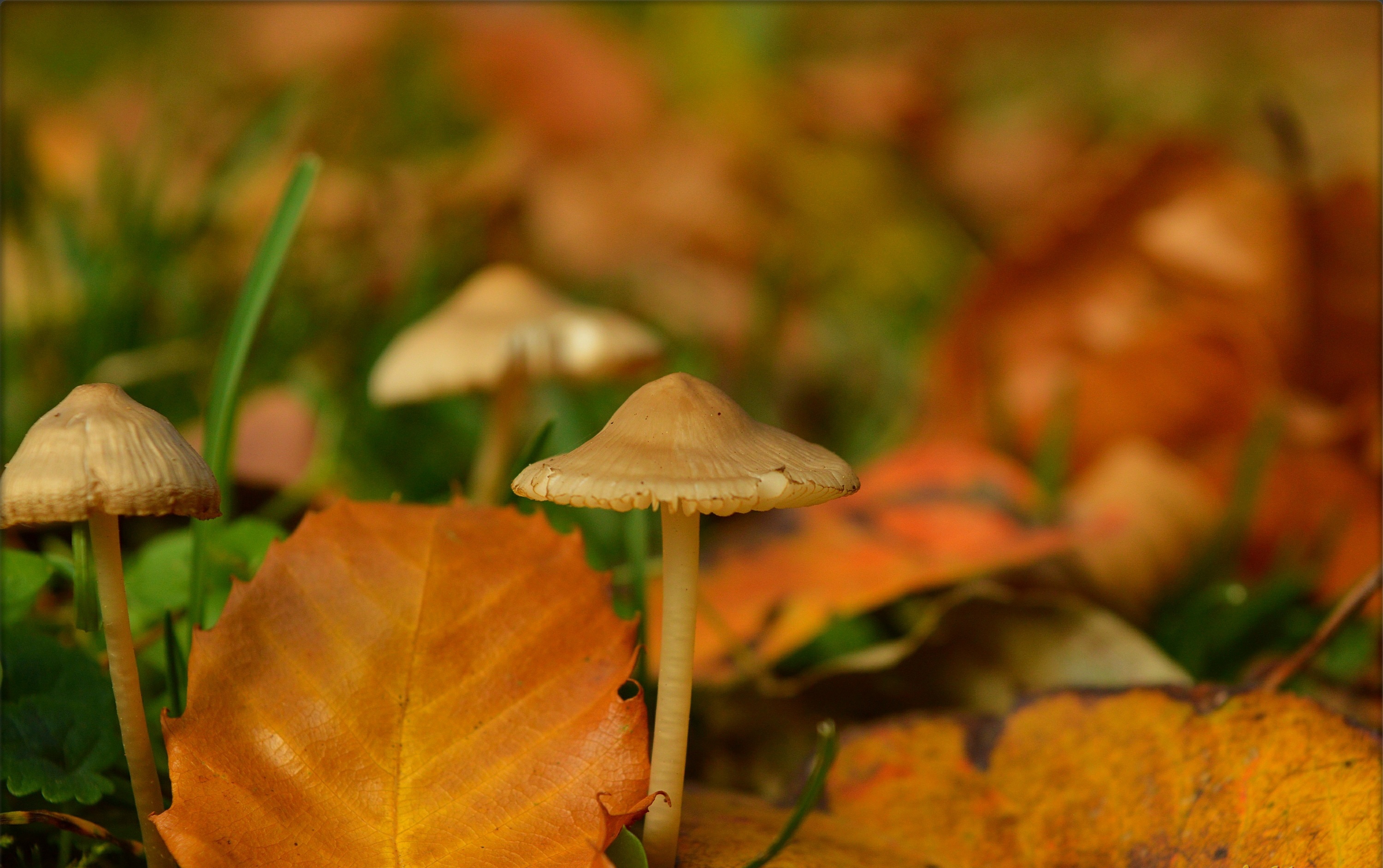 Маленькие грибы поганки под желтыми опавшими листьями - 3000x1883