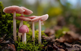 Гриб розовая мицена на покрытой мхом земле