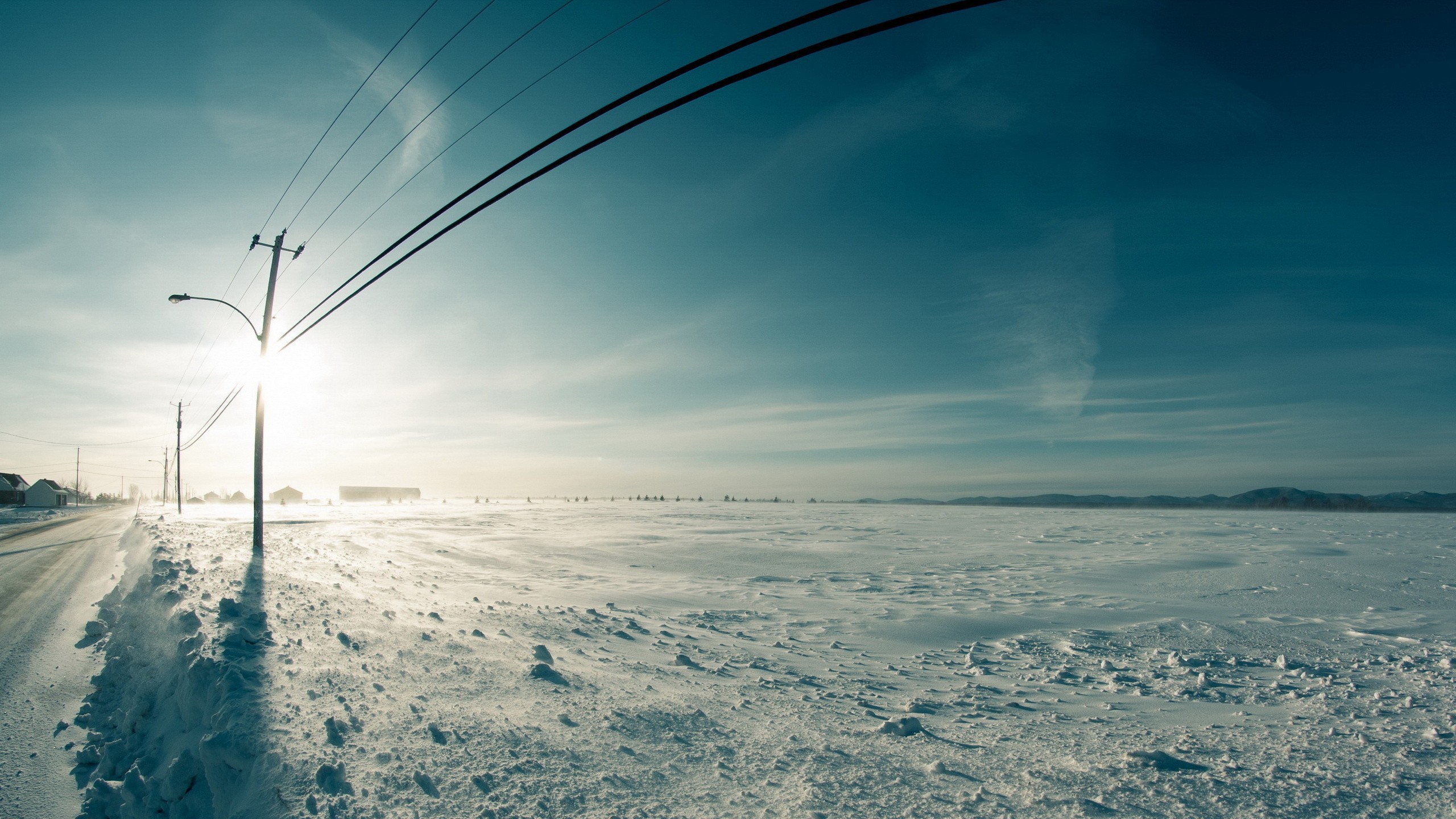 Линия электропередач вдоль заснеженного поля - 2560x1440