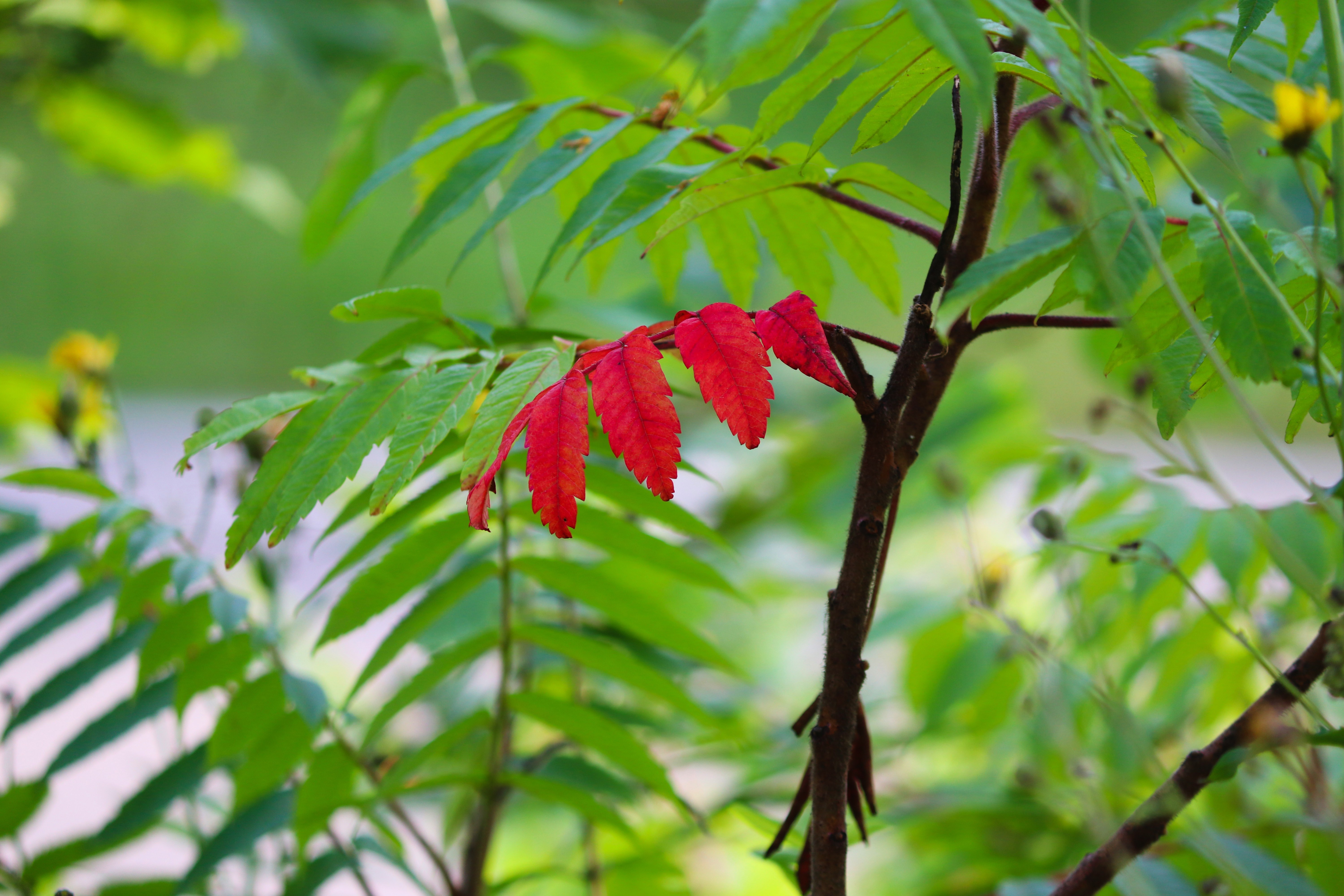 Красный лист среди зеленых листьев на рябине - 6000x4000