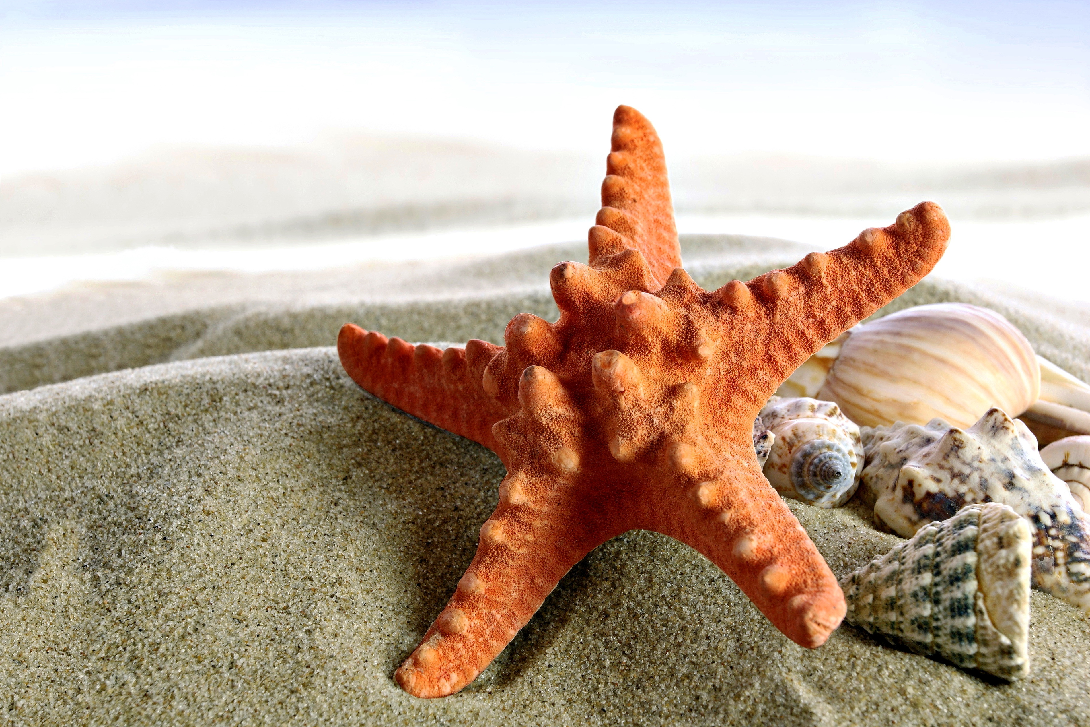 Морская звезда и ракушки на песке крупным планом - 3800x2533