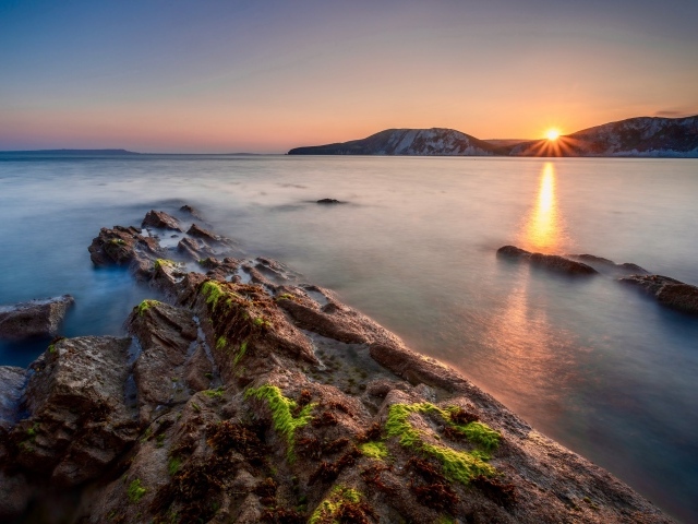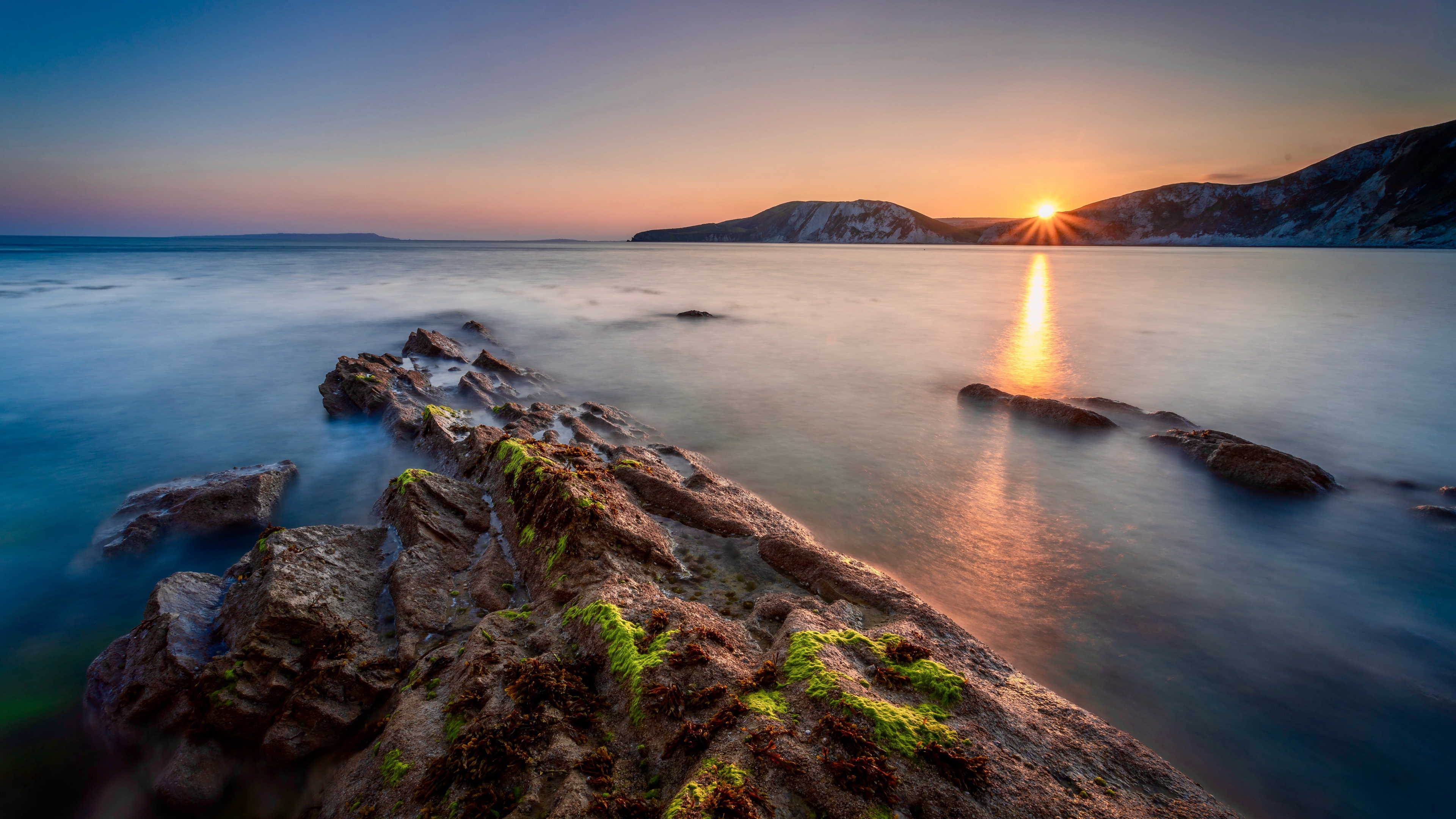 Спокойная вода в море с подводными камнями на закате - 3840x2160