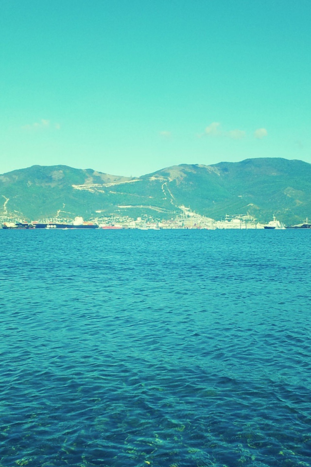 Синее море и зеленые горы Обои для рабочего стола 640x960