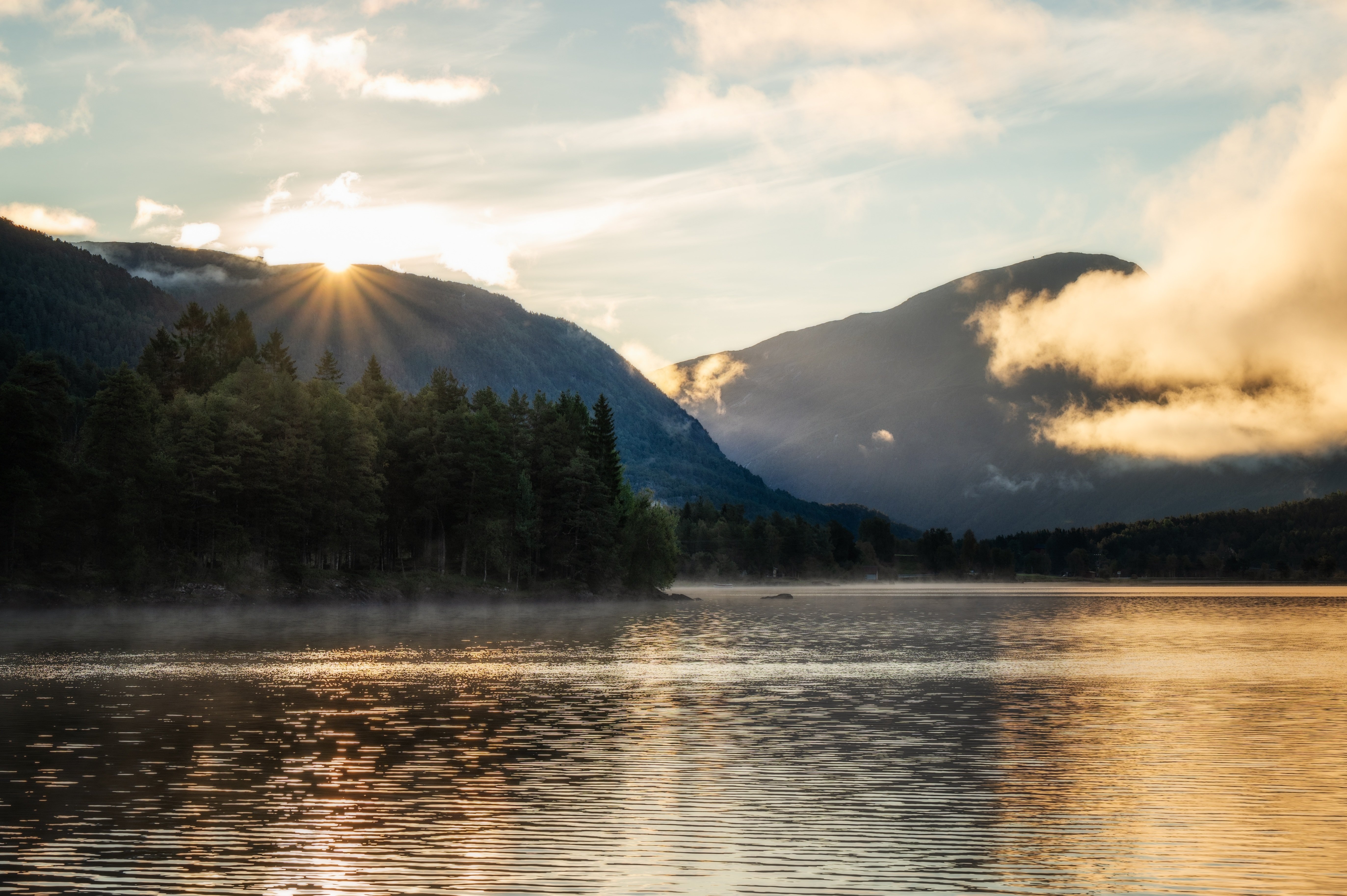 Горы и спокойное озеро на закате солнца - 5490x3653