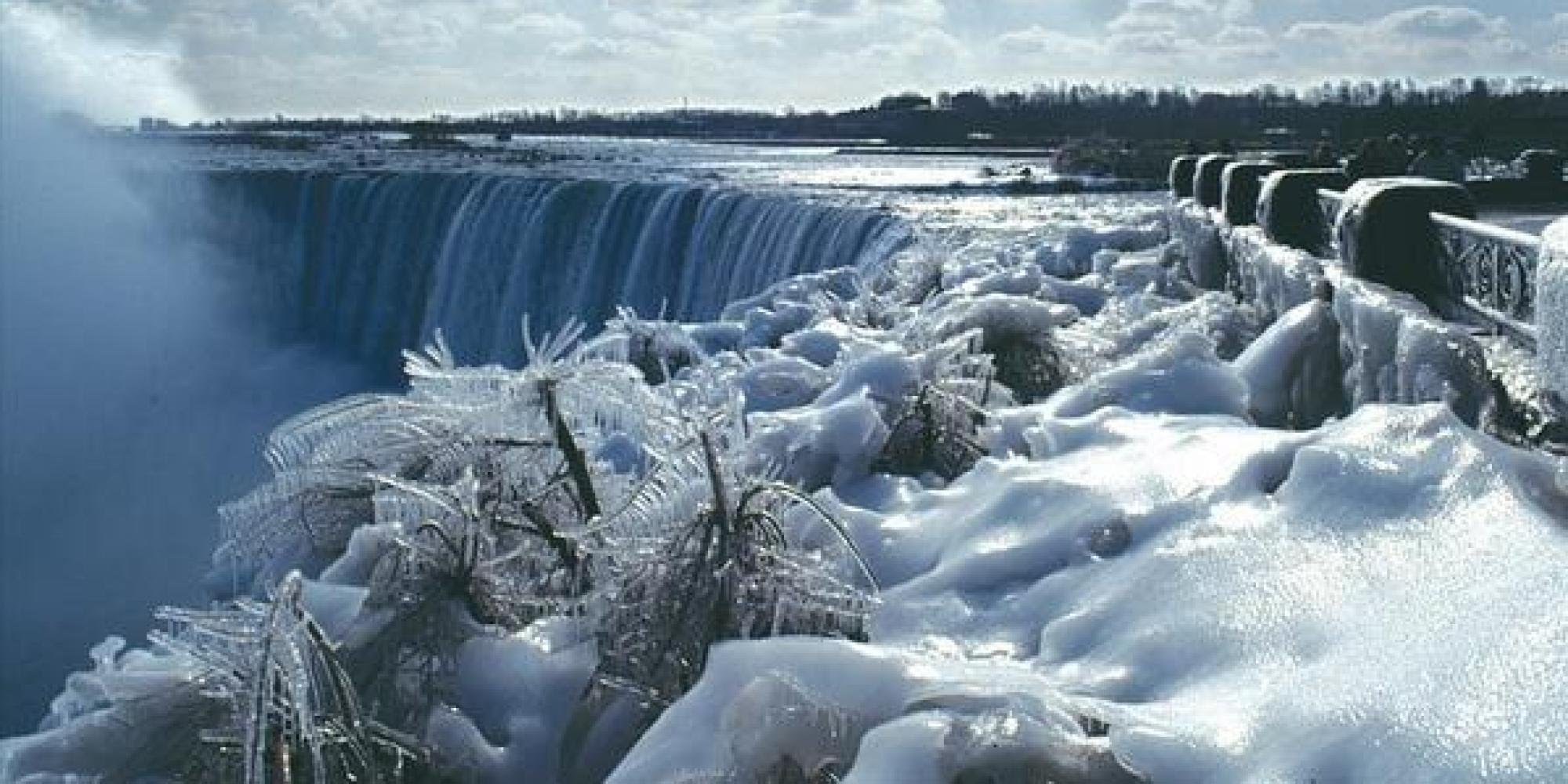 Обледеневшие растения на фоне замерзшего водопада - 2000x1000