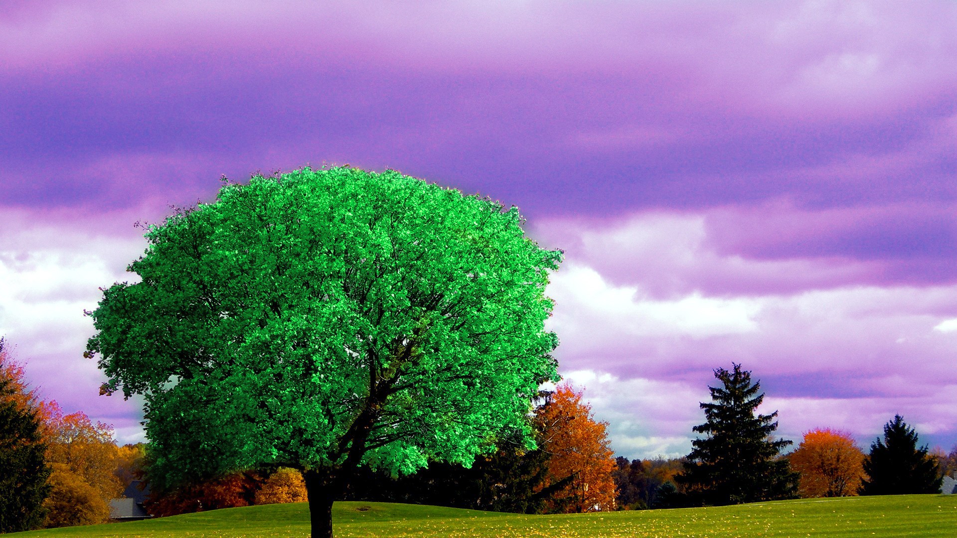 Ярко зеленое дерево на фоне осени - 1920x1080