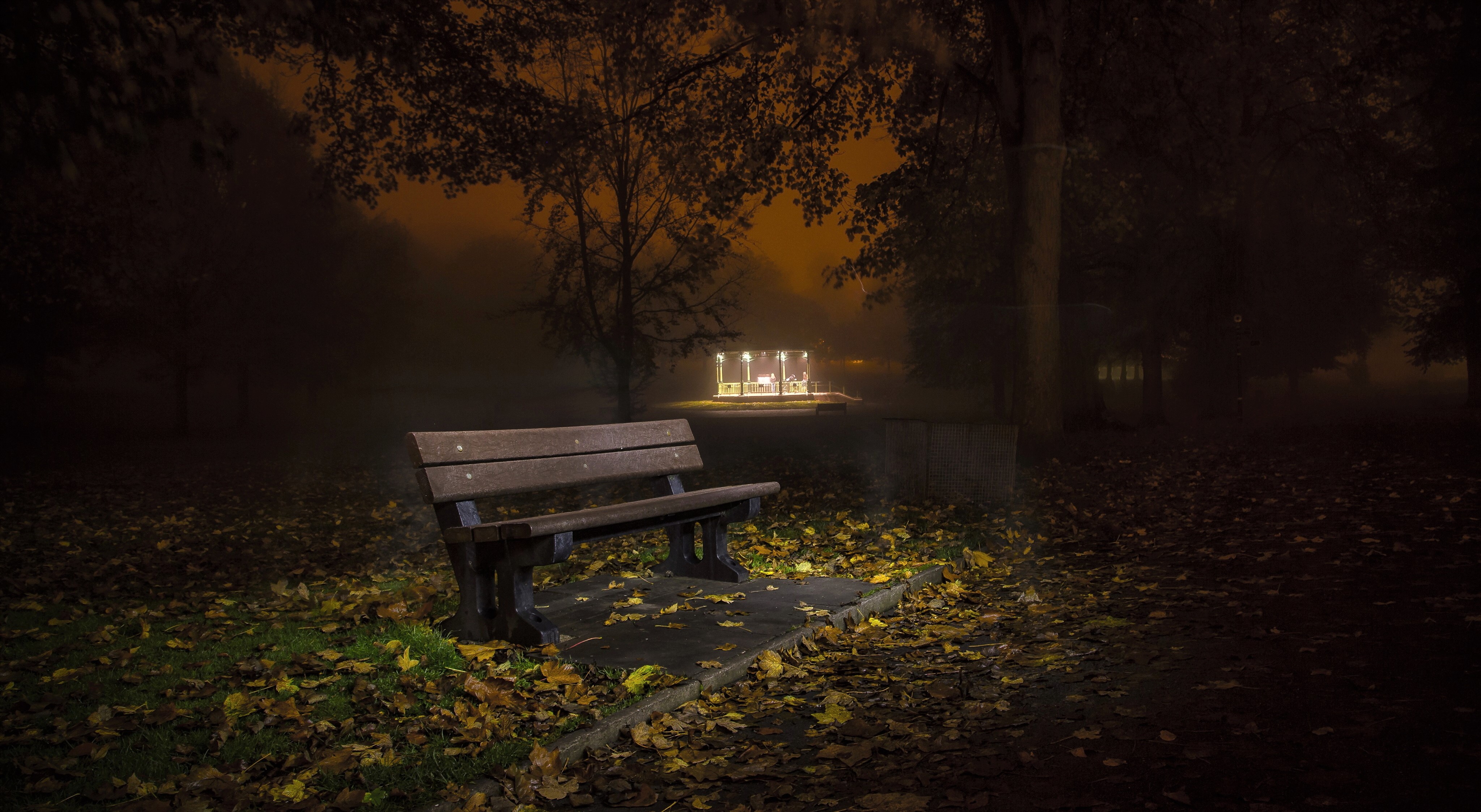 Одинокая скамейка в осеннем парке ночью - 4095x2246
