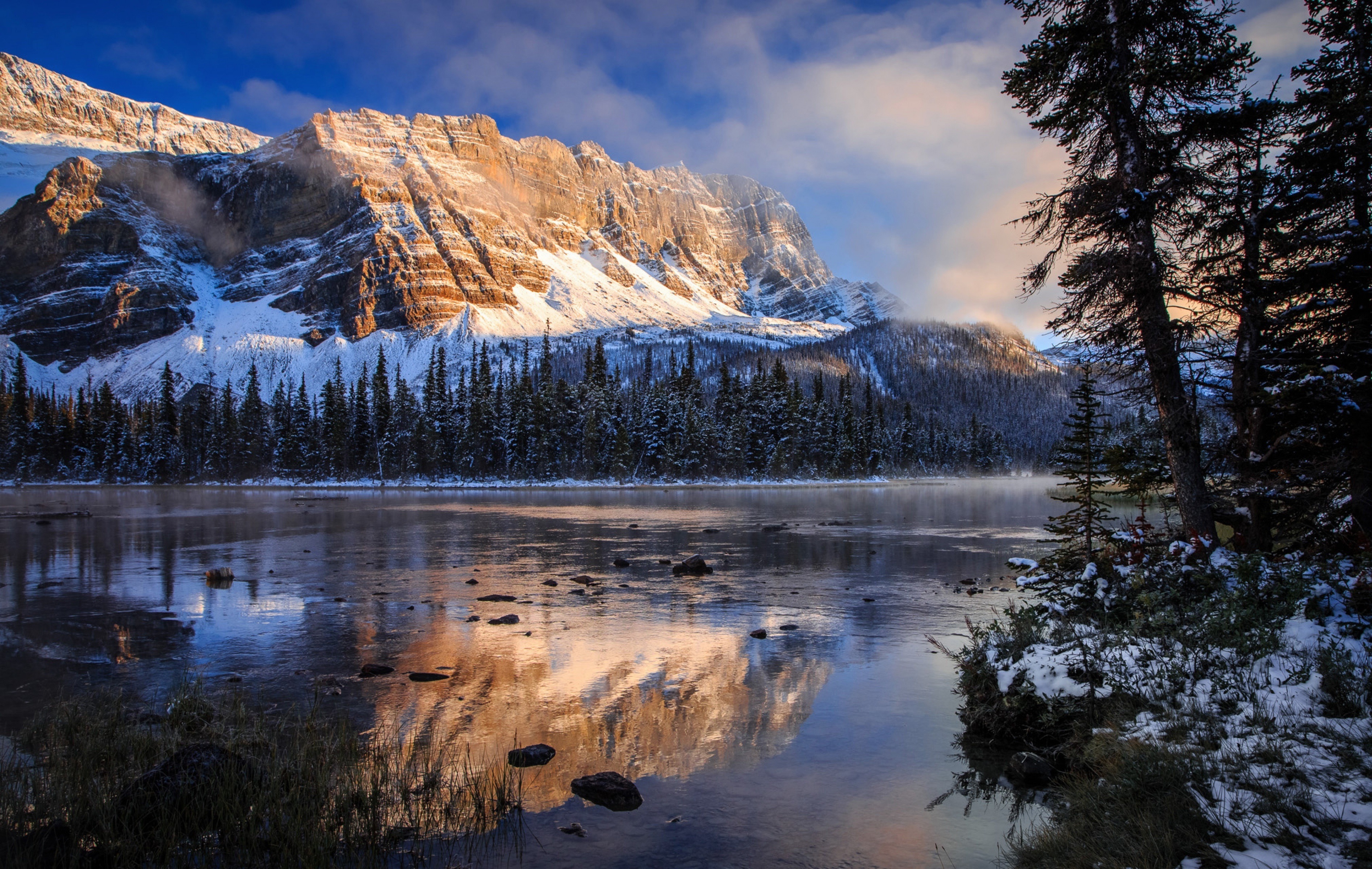 Покрытые снегом горы у заледеневшего озера - 3788x2400