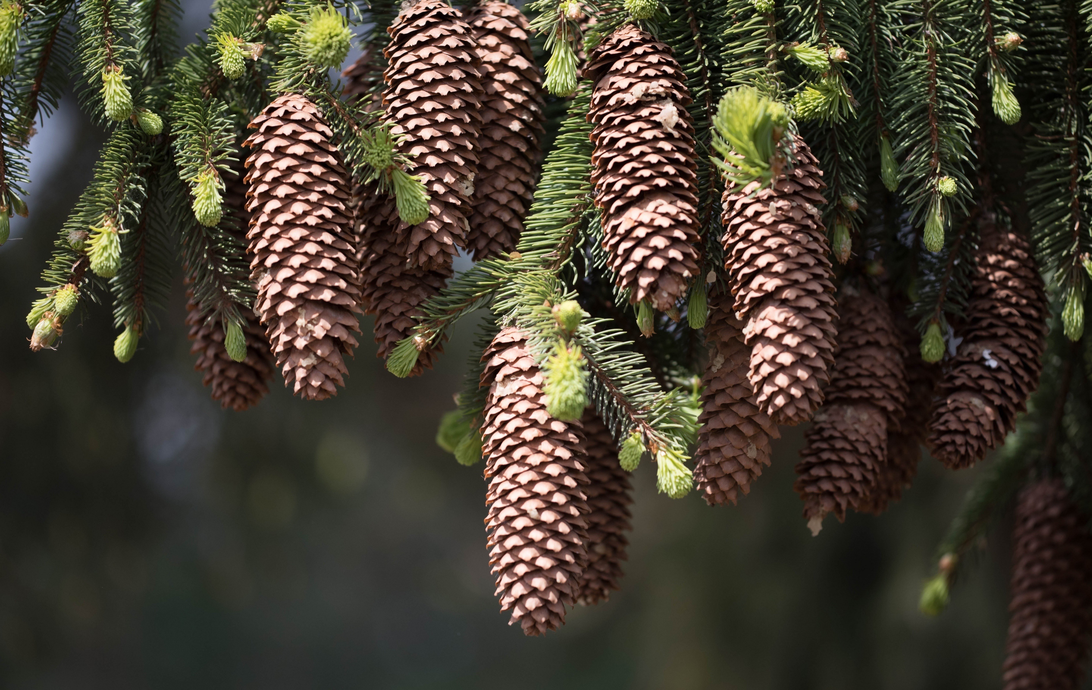 Большие шишки на зеленых ветках ели - 3796x2400