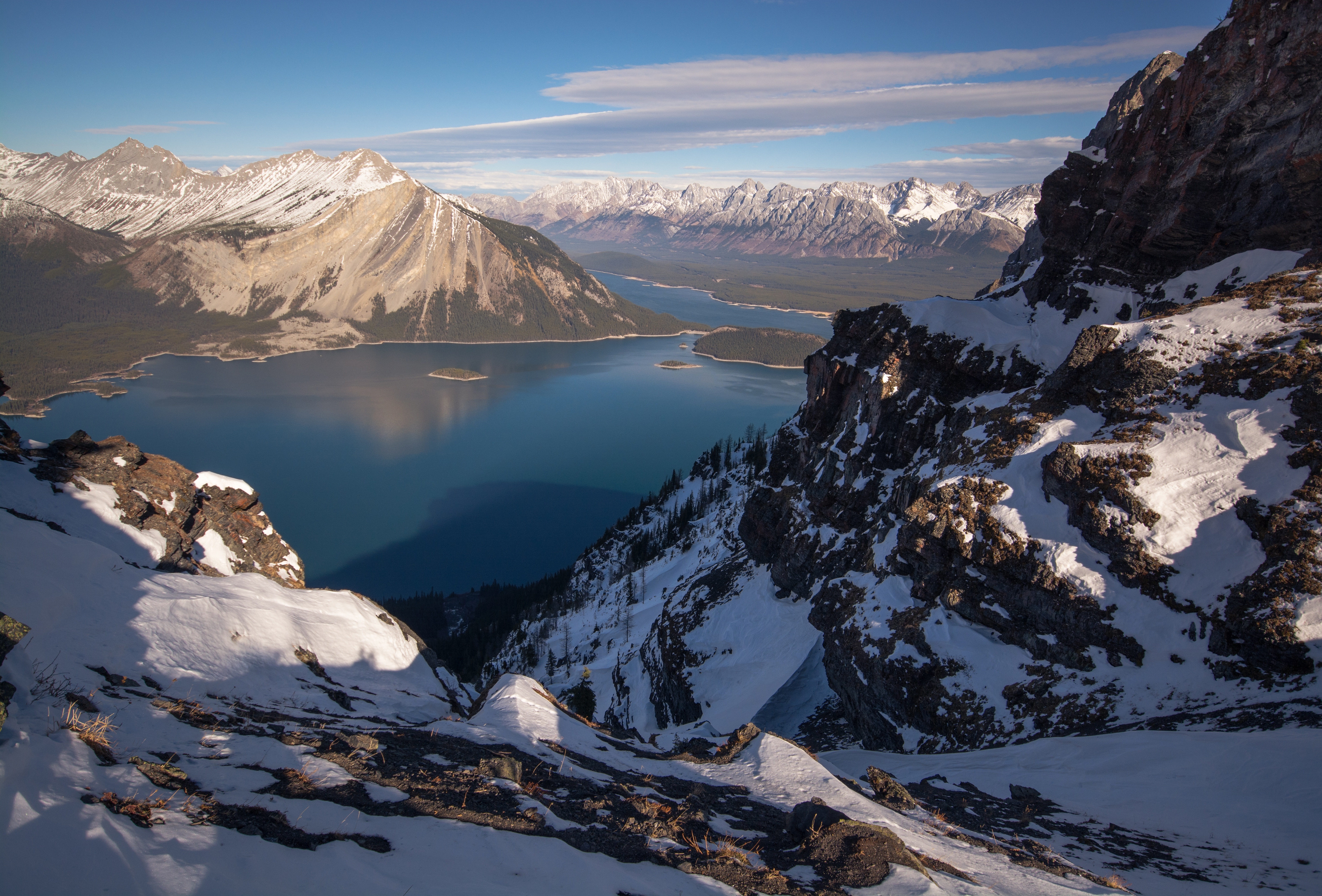 Озеро между заснеженных гор на фоне голубого неба - 5901x4000