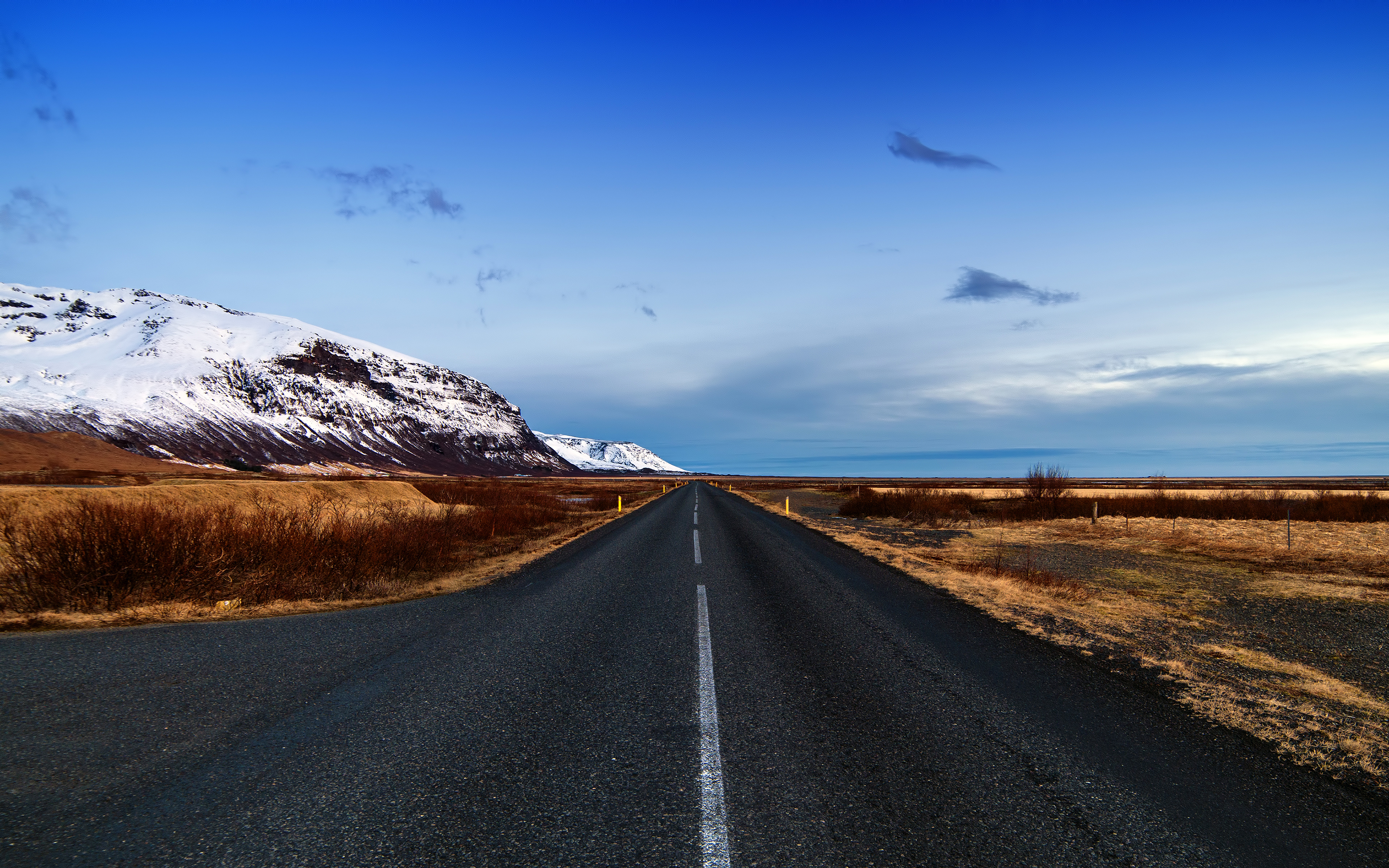 Ровная асфальтовая дорога у заснеженных гор - 3840x2400