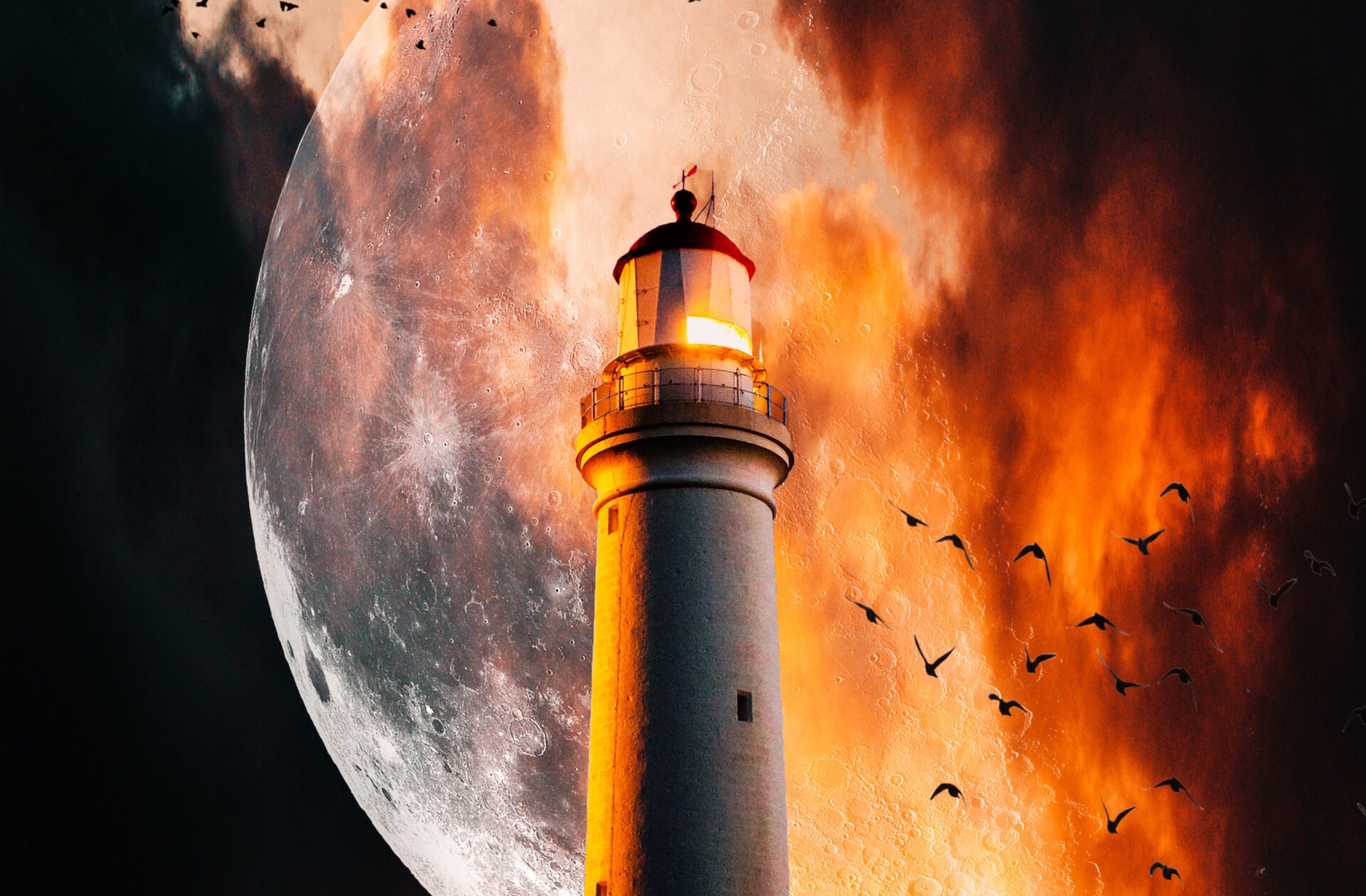 Маяк на фоне огромной луны - 3240x2126
