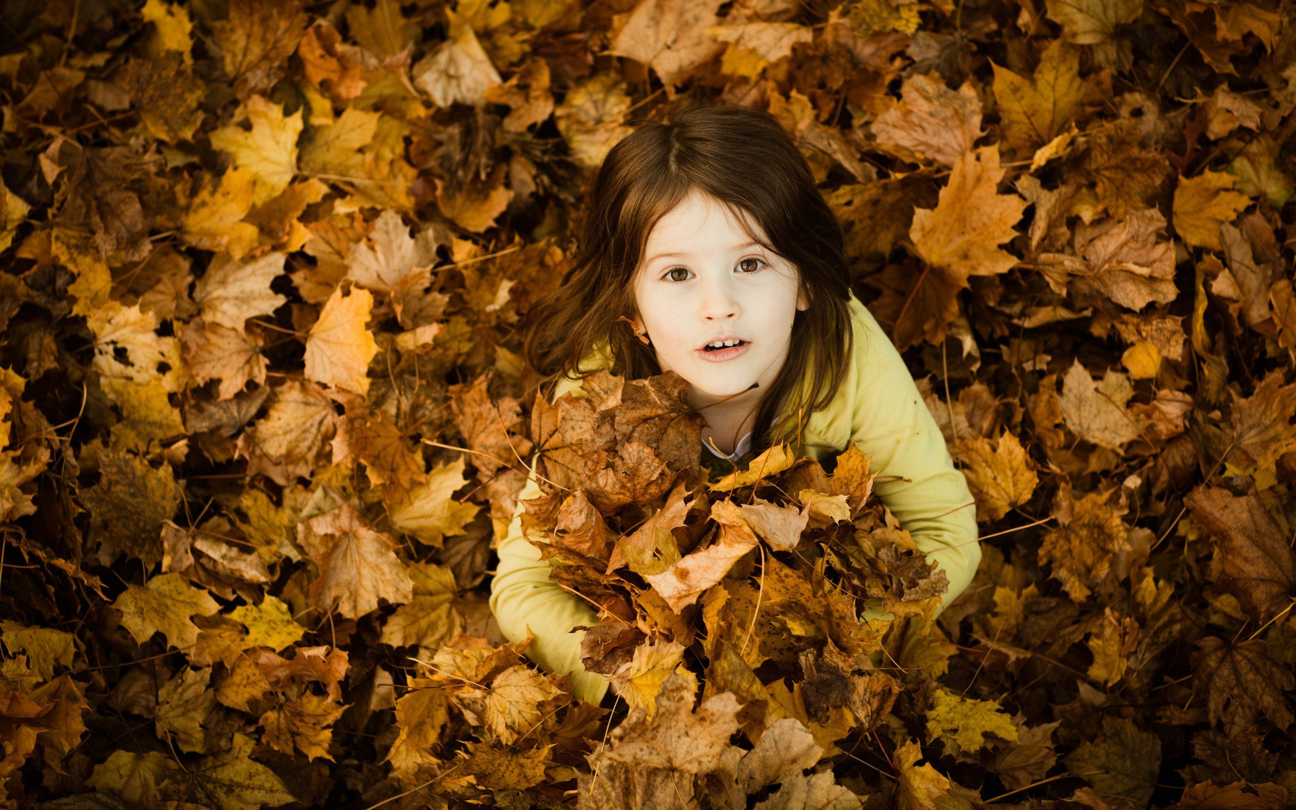 Девочка зарылась в опавшие листья - 2560x1600